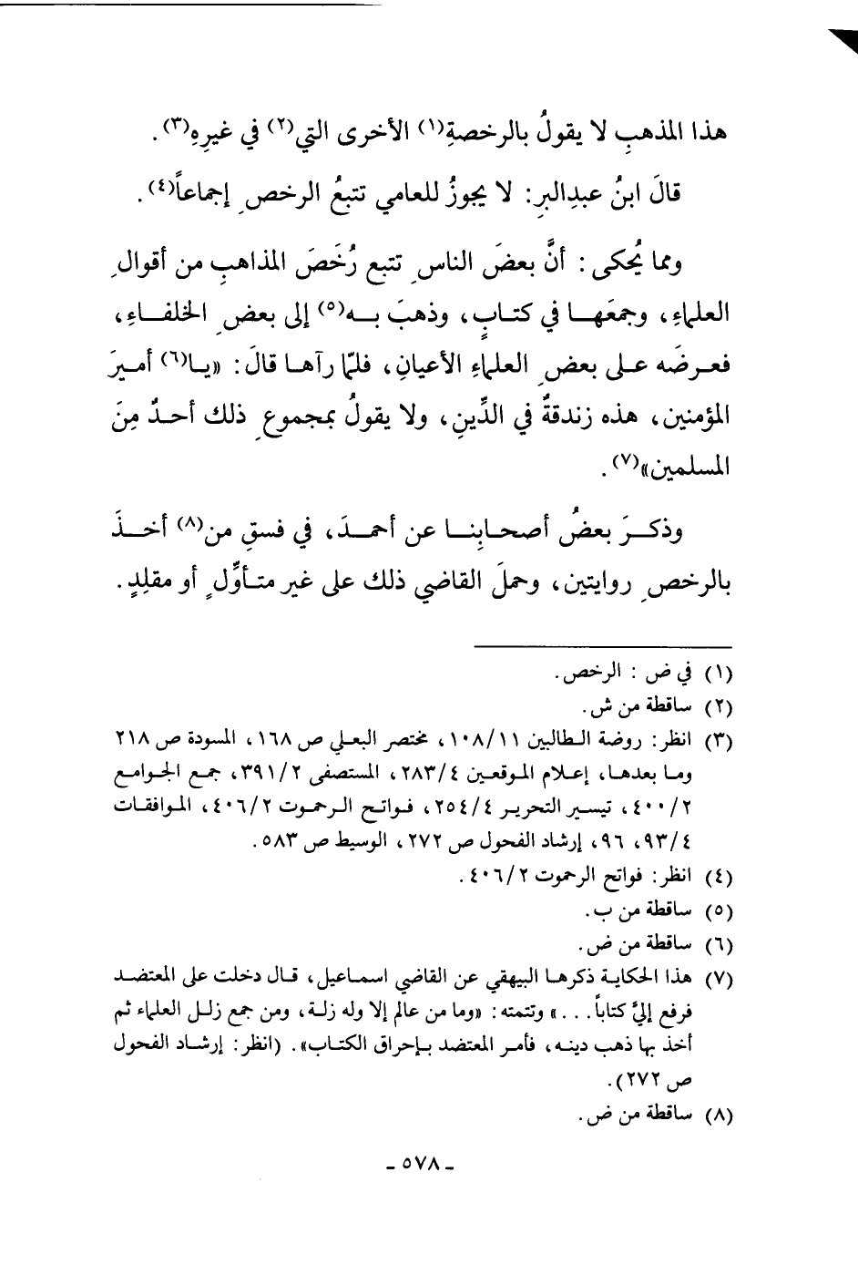 7 هذه الحكاية ذكرها البيهقي عن القاضي إسماعيل، قال دخلت على المعتضد فرفع إليّ كتاباً ... " وتتمته: "وما من عالم إلا وله زلة، ومن جمع زلل العلماء ثم أخذ بها ذهب دينه، فأمر المعتضد بإحراق الكتاب" "انظر: إرشاد الفحول ص 272".