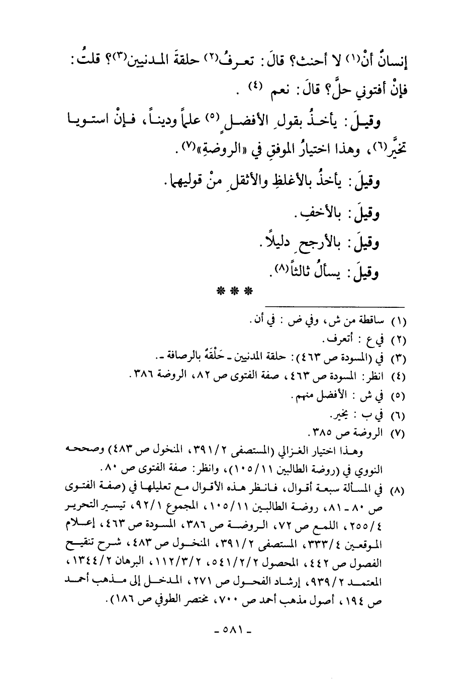 4 انظر: المسودة ص 463،صفة الفتوى ص 82، الروضة 386.