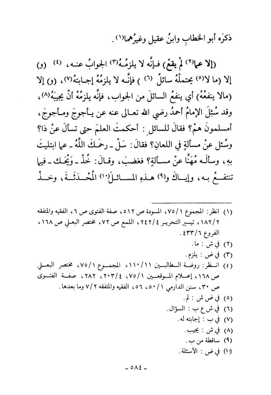 "إلاَّ عَمَّا2 لَمْ يَقَعْ" فَإِنَّهُ لا يَلْزَمُهُ3 الْجَوَابُ عَنْهُ4 "وَ" إلاَّ "مَا لا5 يَحْتَمِلُهُ سَائِلٌ6" فَإِنَّهُ لا يَلْزَمُهُ إجَابَتُهُ7 "وَ" إلاَّ "مَا لا يَنْفَعُهُ" أَيْ: يَنْفَعُ السَّائِلَ مِنْ الْجَوَابِ، فَإِنَّهُ يَلْزَمُهُ أَنْ يُجِيبَهُ8، وَقَدْ سُئِلَ الإِمَامُ أَحْمَدُ رَضِيَ اللَّهُ تَعَالَى عَنْهُ عَنْ يَأْجُوجَ وَمَأْجُوجَ. أَمُسْلِمُونَ هُمْ؟ فَقَالَ لِلسَّائِلِ: أَحْكَمْتَ الْعِلْمَ حَتَّى تَسْأَلَ عَنْ ذَا؟ وَسُئِلَ عَنْ مَسْأَلَةٍ فِي اللِّعَانِ؟ فَقَالَ: سَلْ -رَحِمَك اللَّهُ- عَمَّا اُبْتُلِيتَ بِهِ، وَسَأَلَهُ مُهَنَّا عَنْ مَسْأَلَةٍ؟ فَغَضِبَ وَقَالَ: خُذْ -وَيْحَكَ- فِيمَا تَنْتَفِعُ بِهِ، وَإِيَّاكَ وَ9هَذِهِ الْمَسَائِلَ الْمُحْدَثَةَ10، وَخُذْ
