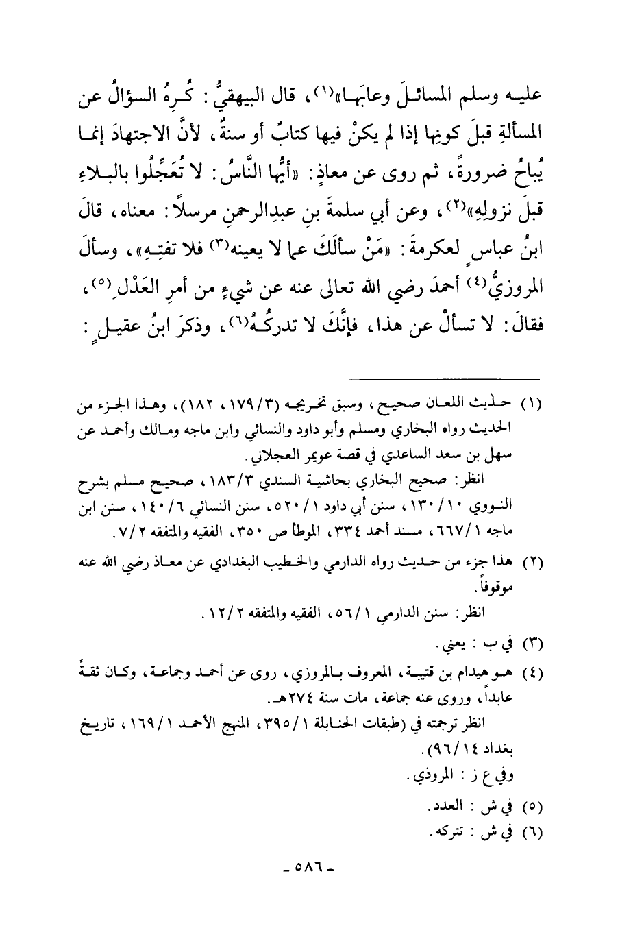 عَلَيْهِ وَسَلَّمَ الْمَسَائِلَ وَعَابَهَا1 قَالَ الْبَيْهَقِيُّ: كُرِهَ السُّؤَالُ عَنْ الْمَسْأَلَةِ قَبْلَ كَوْنِهَا إذَا لَمْ يَكُنْ فِيهَا كِتَابٌ أَوْ سُنَّةٌ؛ لأَنَّ الاجْتِهَادَ إنَّمَا يُبَاحُ ضَرُورَةً، ثُمَّ رُوِيَ عَنْ مُعَاذٍ: "أَيُّهَا النَّاسُ: لا تُعَجِّلُوا بِالْبَلاءِ قَبْلَ نُزُولِهِ"2 وَعَنْ أَبِي سَلَمَةَ بْنِ عَبْدِ الرَّحْمَنِ مُرْسَلاً: مَعْنَاهُ. قَالَ ابْنُ عَبَّاسٍ لِعِكْرِمَةَ "مَنْ سَأَلَك عَمَّا لا يَعْنِيهِ3 فَلا تُفْتِهِ" وَسَأَلَ الْمَرْوَزِيُّ4 أَحْمَدَ رَضِيَ اللَّهُ تَعَالَى عَنْهُ عَنْ شَيْءٍ مِنْ أَمْرِ الْعَدْلِ5. فَقَالَ: لا تَسْأَلْ عَنْ هَذَا، فَإِنَّك لا تُدْرِكُهُ6، وَذَكَرَ ابْنُ عَقِيلٍ: