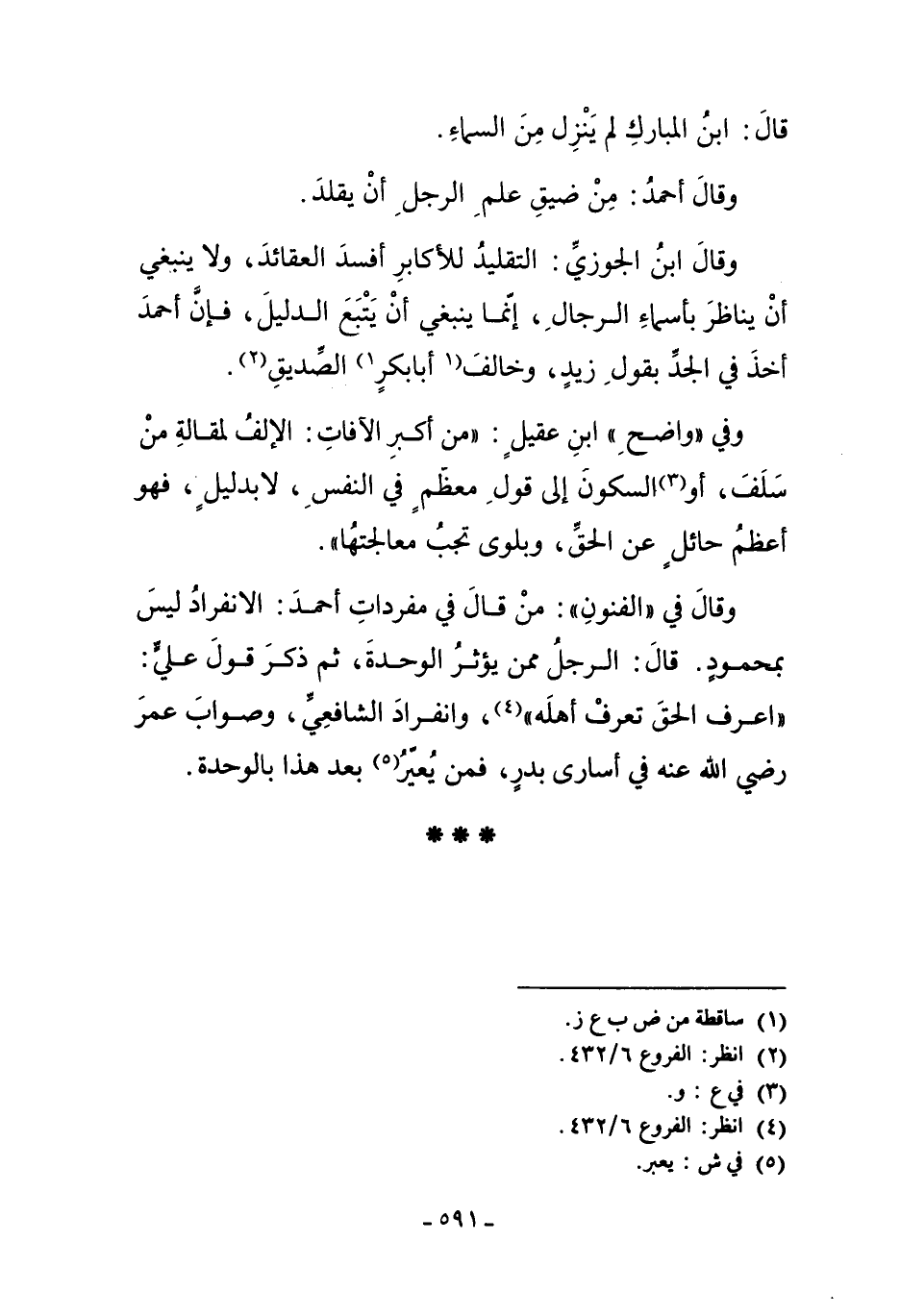 وَقَالَ فِي الْفُنُونِ: مَنْ قَالَ فِي مُفْرَدَاتِ أَحْمَدَ: الانْفِرَادُ لَيْسَ بِمَحْمُودٍ، قَالَ: الرَّجُلُ مِمَّنْ يُؤْثِرُ الْوَحْدَةَ. ثُمَّ ذَكَرَ قَوْلَ عَلِيٍّ " اعْرَفْ الْحَقَّ تَعْرِفْ أَهْلَهُ "4 وَانْفِرَادُ الشَّافِعِيِّ، وَصَوَابُ عُمَرَ رَضِيَ اللَّهُ عَنْهُ فِي أُسَارَى بَدْرٍ، فَمَنْ يُعَيَّرُ5 بَعْدَ هَذَا بِالْوَحْدَةِ.