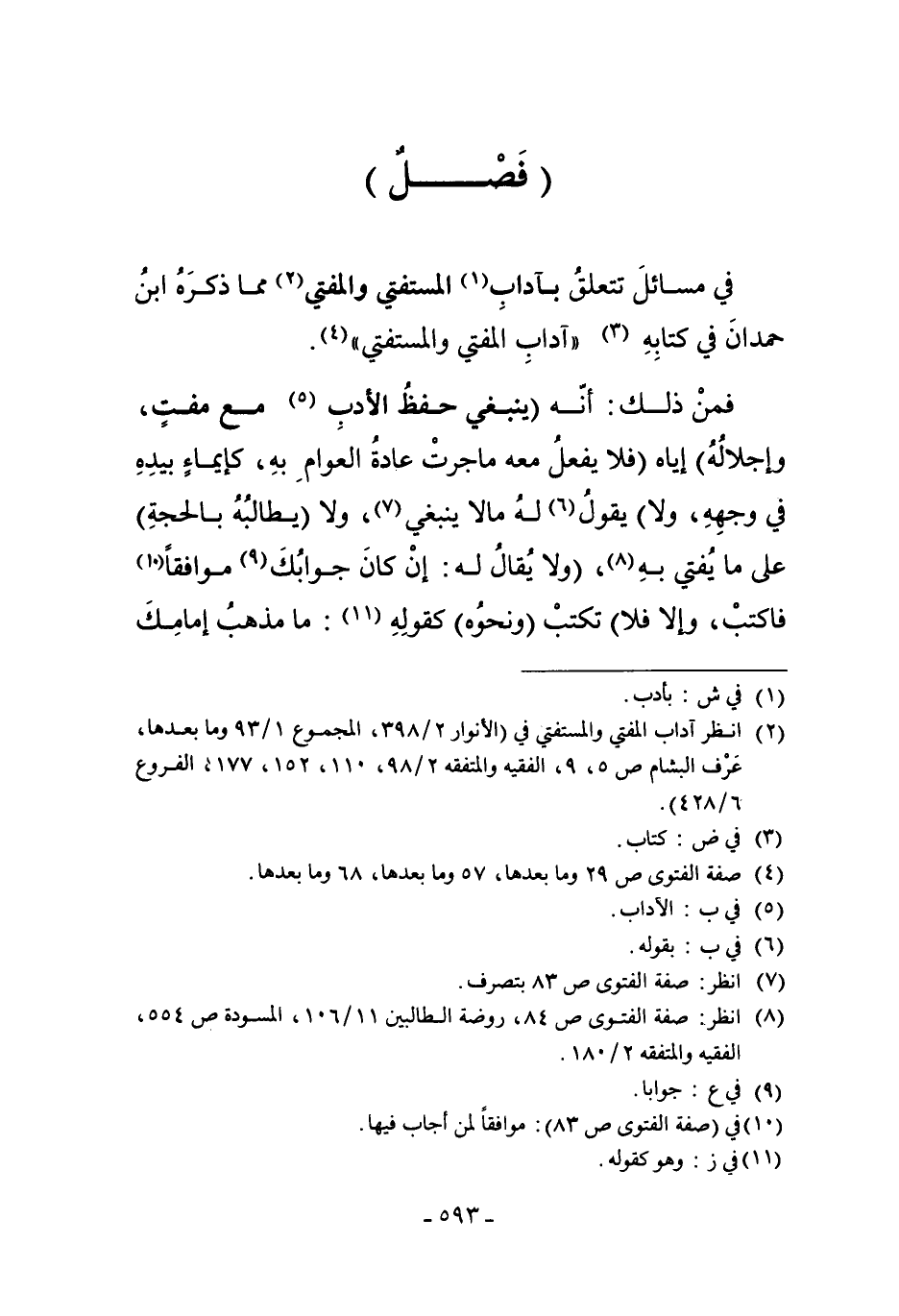 2 انظر آدادب المفتي والمستفتي في "الأنوار 2/398، المجموع 1/93 وما بعدها، عرف البشام ص 5، 9، الفقيه والمتفقه 2/98، 110، 177، الفروع 6/428".