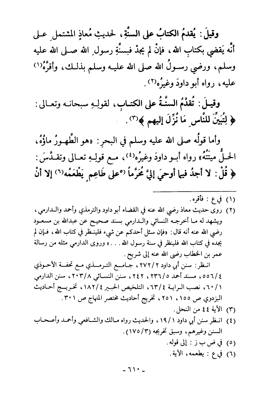 وَقِيلَ: يُقَدَّمُ الْكِتَابُ عَلَى السُّنَّةِ؛ لِحَدِيثِ مُعَاذٍ الْمُشْتَمِلِ عَلَى أَنَّهُ يَقْضِي بِكِتَابِ اللَّهِ، فَإِنْ لَمْ يَجِدْ فَبِسُنَّةِ رَسُولِ اللَّهِ صَلَّى اللَّهُ عَلَيْهِ وَسَلَّمَ، وَرَضِيَ رَسُولُ اللَّهِ صَلَّى اللَّهُ عَلَيْهِ وَسَلَّمَ بِذَلِكَ وَأَقَرَّهُ1 عَلَيْهِ. رَوَاهُ أَبُو دَاوُد وَغَيْرُهُ2.