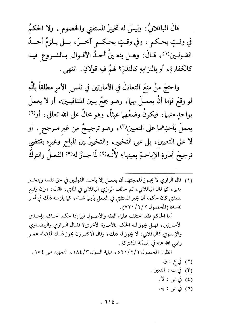 1 قال الرازي لا يجوز للمجتهد أن يعمل إلا بأحد القولين في حق نفسه ويتخير منهما، كما قال الباقلاني، ثم خالف الرازي الباقلاني في المفتي، فقال: "وإن وقع للمفتي كان حكمه أن يخير المستفتي في العمل بأيهما شاء، كما يلزمه ذلك في أمر نفسه" "المحصول 2/2/520".