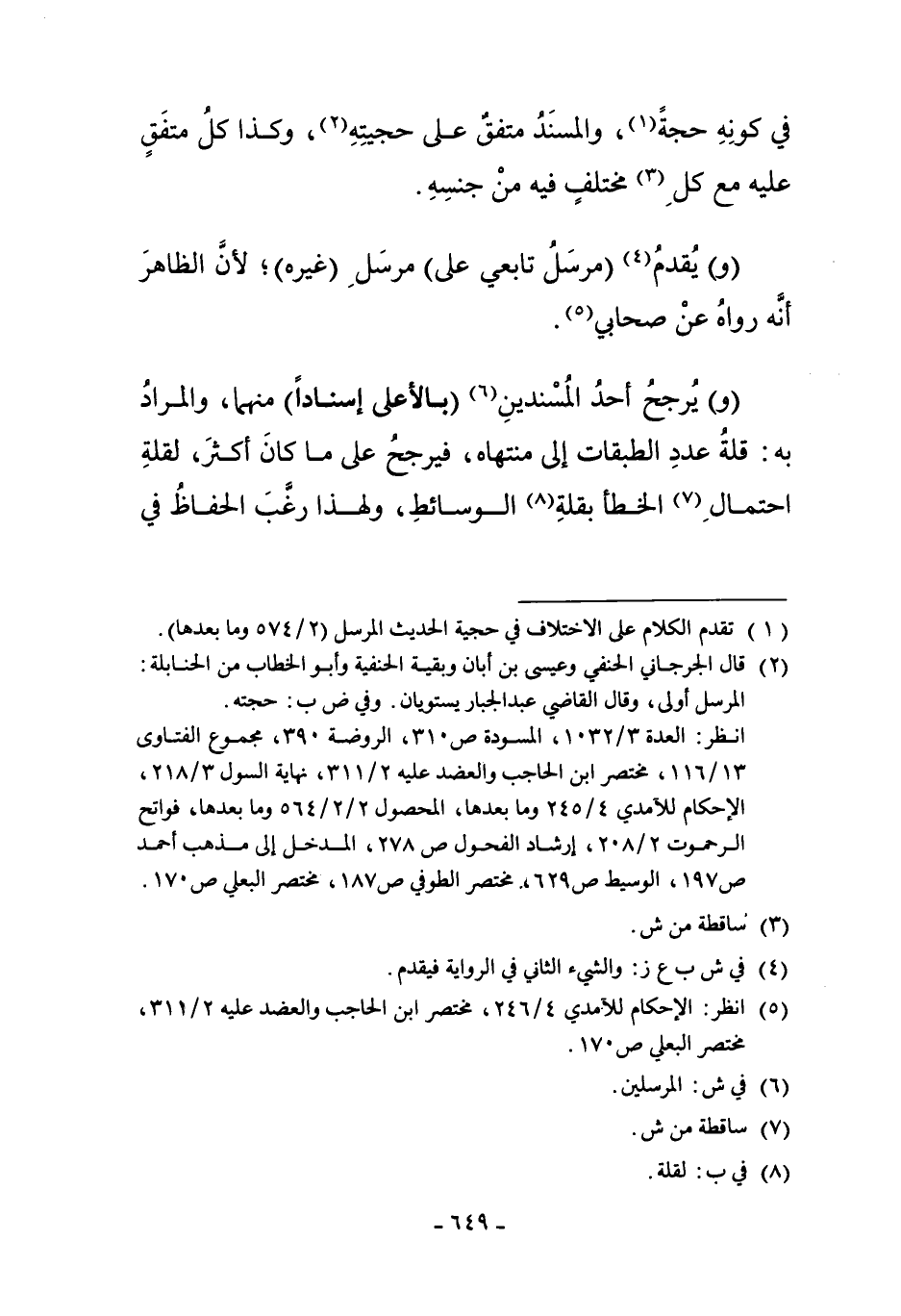 2 قال الجرجاني الحنفي وعيسى بن أبان وبقية الحنفية وأبو الخطاب من الحنابلة: المرسل أولى، وقال القاضي عبد الجبار يستويان، وفي ض ب: حجته.