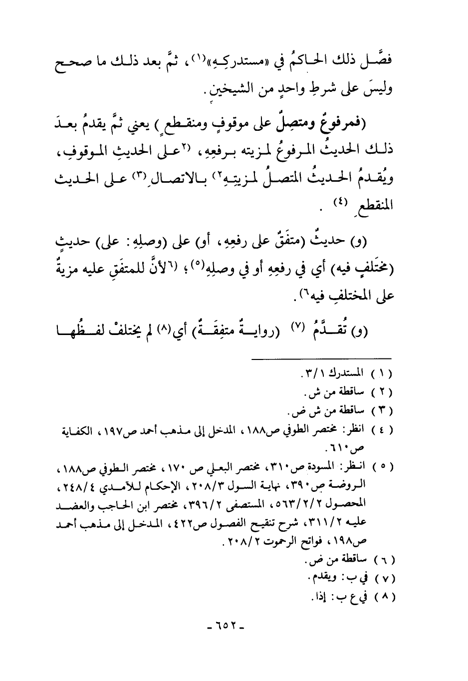 "فَمَرْفُوعٌ، وَمُتَّصِلٌ عَلَى مَوْقُوفٍ، وَمُنْقَطِعٍ" يَعْنِي ثُمَّ يُقَدَّمُ بَعْدَ ذَلِكَ الْحَدِيثُ الْمَرْفُوعُ؛ لِمَزِيَّتِهِ بِرَفْعِهِ عَلَى الْحَدِيثِ الْمَوْقُوفِ، وَيُقَدَّمُ الْحَدِيثُ الْمُتَّصِلُ لِمَزِيَّتِهِ2 بِالاتِّصَالِ3 عَلَى الْحَدِيثِ الْمُنْقَطِعِ4.