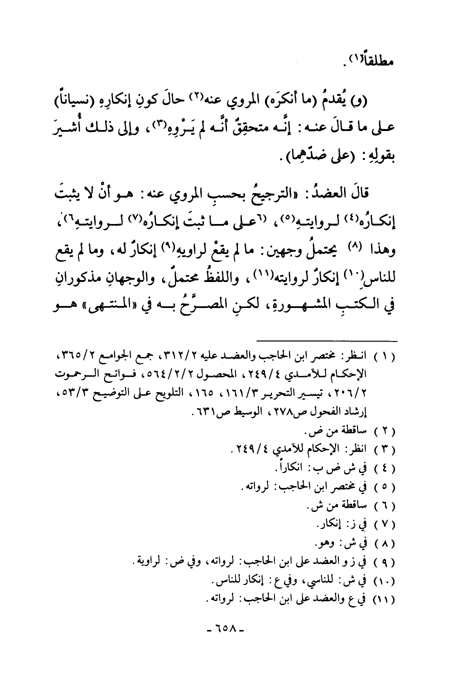 قَالَ الْعَضُدُ: التَّرْجِيحُ بِحَسَبِ الْمَرْوِيِّ عَنْهُ: هُوَ أَنْ لا يَثْبُتَ إنْكَارُهُ4 لِرِوَايَتِهِ5، 6عَلَى مَا ثَبَتَ إنْكَارُهُ7 لِرِوَايَتِهِ وَهَذَا8 يَحْتَمِلُ وَجْهَيْنِ مَا لَمْ يَقَعْ لِرَاوِيهِ9 إنْكَارٌ لَهُ، وَمَا لَمْ يَقَعْ لِلنَّاسِي10 إنْكَارٌ لِرِوَايَتِهِ11، وَاللَّفْظُ مُحْتَمَلٌ. وَالْوَجْهَانِ مَذْكُورَانِ فِي الْكُتُبِ الْمَشْهُورَةِ، لَكِنْ الْمُصَرَّحُ بِهِ فِي الْمُنْتَهَى هُوَ