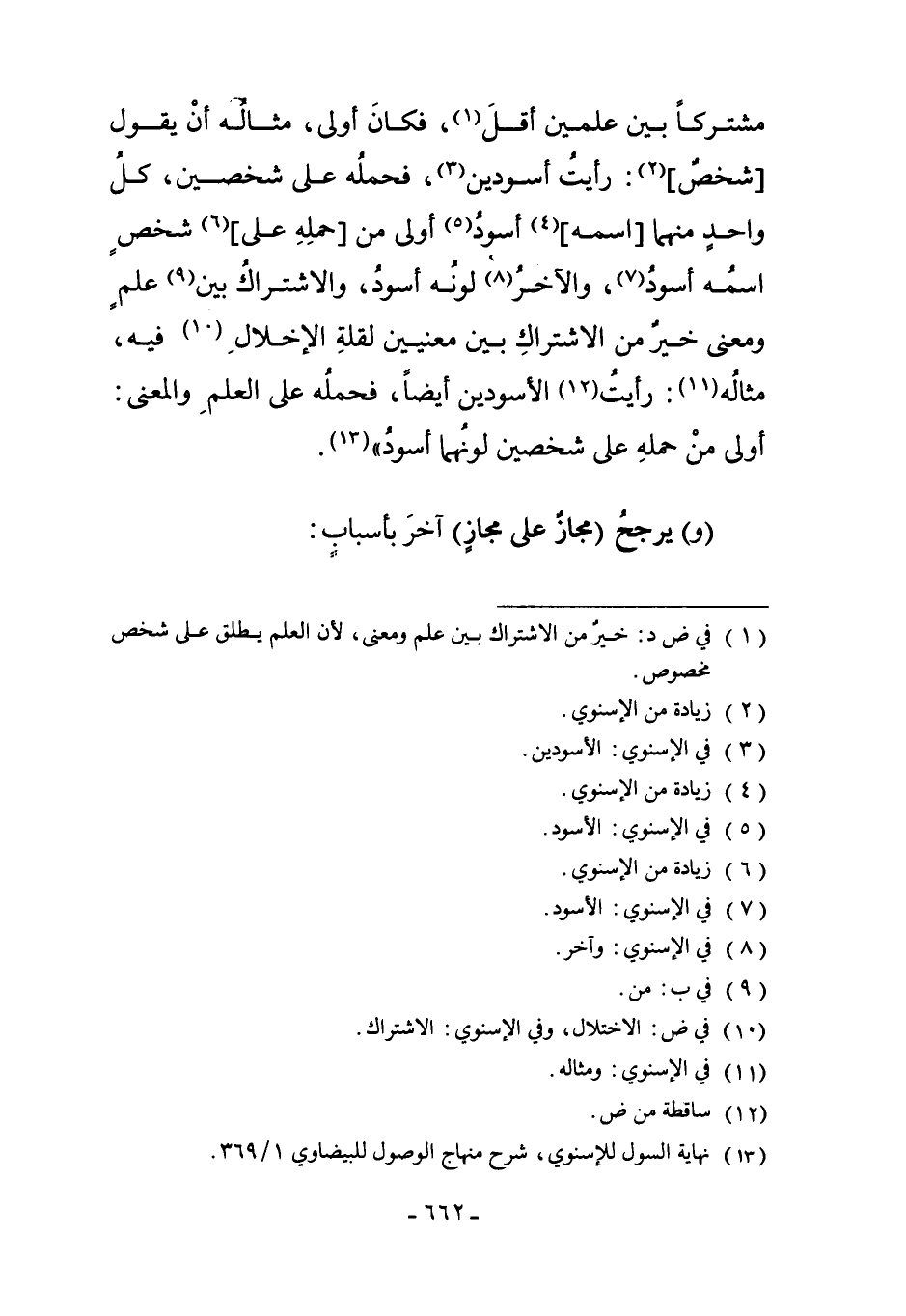 مُشْتَرَكًا بَيْنَ عَلَمَيْنِ أَقَلَّ1، فَكَانَ أَوْلَى. مِثَالُهُ أَنْ يَقُولَ [شَخْصٌ] 2: رَأَيْت أَسْوَدَيْنِ3، فَحَمَلَهُ عَلَى شَخْصَيْنِ كُلُّ وَاحِدٍ مِنْهُمَا [اسْمُهُ] 4 أَسْوَدُ5: أَوْلَى مِنْ [حَمْلِهِ عَلَى] 6 شَخْصٍ اسْمُهُ أَسْوَدُ7، وَالآخَرُ8 لَوْنُهُ أَسْوَدُ، وَالاشْتِرَاكُ بَيْنَ9 عَلَمٍ، وَمَعْنَى خَيْرٌ مِنْ الاشْتِرَاكِ بَيْنَ مَعْنَيَيْنِ لِقِلَّةِ الإِخْلالِ10 فِيهِ. مِثَالُهُ11: رَأَيْت12 الأَسْوَدَيْنِ أَيْضًا، فَحَمْلُهُ عَلَى الْعَلَمِ وَالْمَعْنَى: أَوْلَى مِنْ حَمْلِهِ عَلَى شَخْصَيْنِ لَوْنُهُمَا أَسْوَدُ 13.