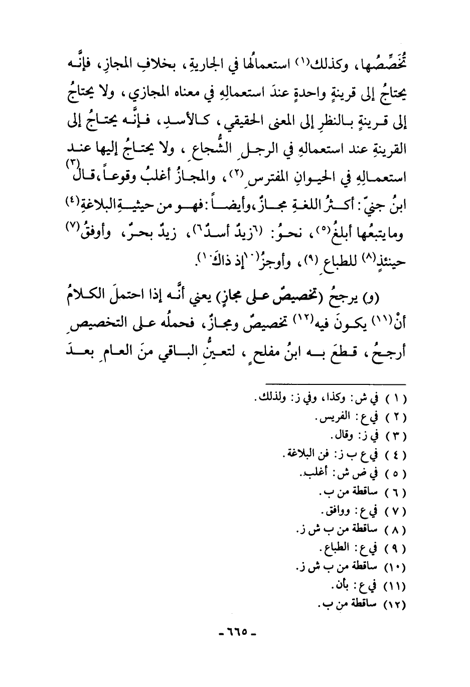 "وَ" يُرَجَّحُ "تَخْصِيصٌ عَلَى مَجَازٍ" يَعْنِي أَنَّهُ إذَا احْتَمَلَ الْكَلامُ أَنْ11 يَكُونَ فِيهِ12 تَخْصِيصٌ وَمَجَازٌ، فَحَمْلُهُ عَلَى التَّخْصِيصِ أَرْجَحُ. قَطَعَ بِهِ ابْنُ مُفْلِحٍ؛ لِتَعَيُّنِ الْبَاقِي مِنْ الْعَامِّ بَعْدَ
