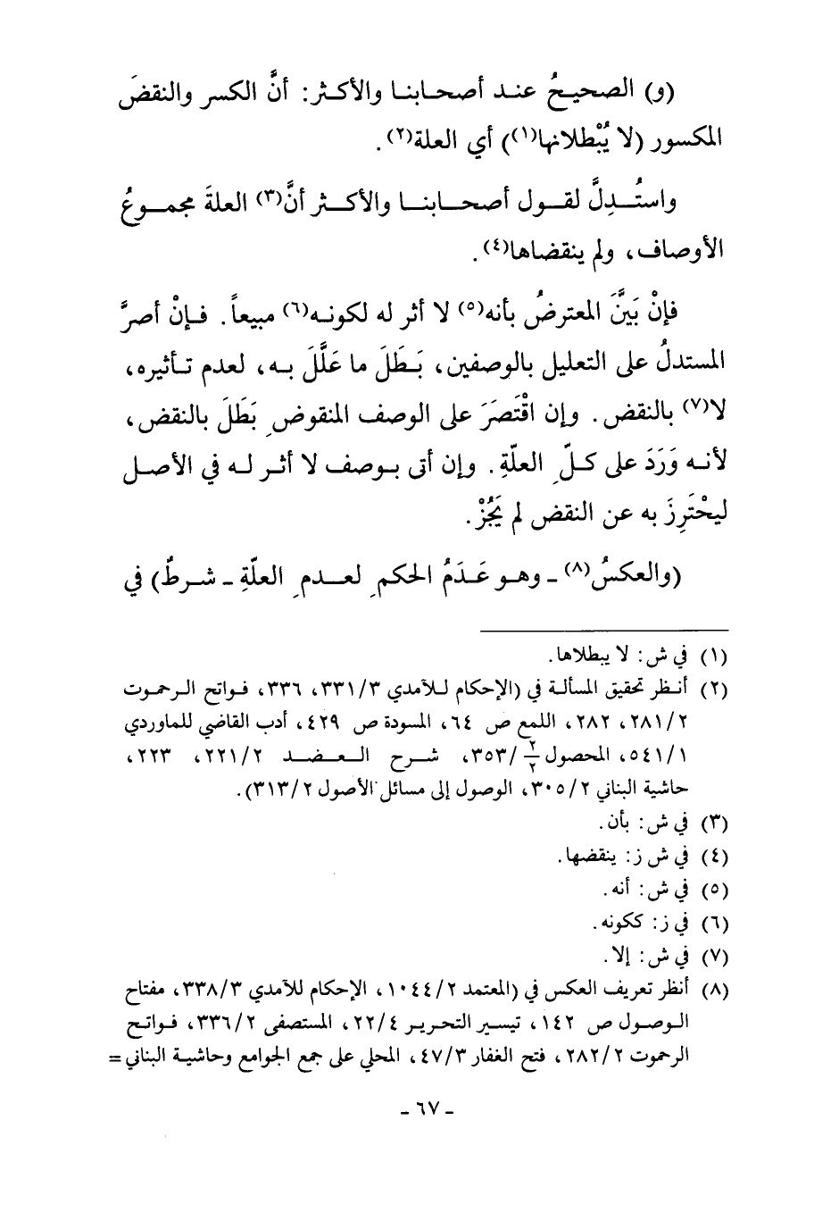 "وَ" الصَّحِيحُ عِنْدَ أَصْحَابِنَا وَالأَكْثَرُ: أَنَّ الْكَسْرَ وَالنَّقْضَ الْمَكْسُورَ "لا يُبْطِلانِهَا1" أَيْ الْعِلَّةَ2.