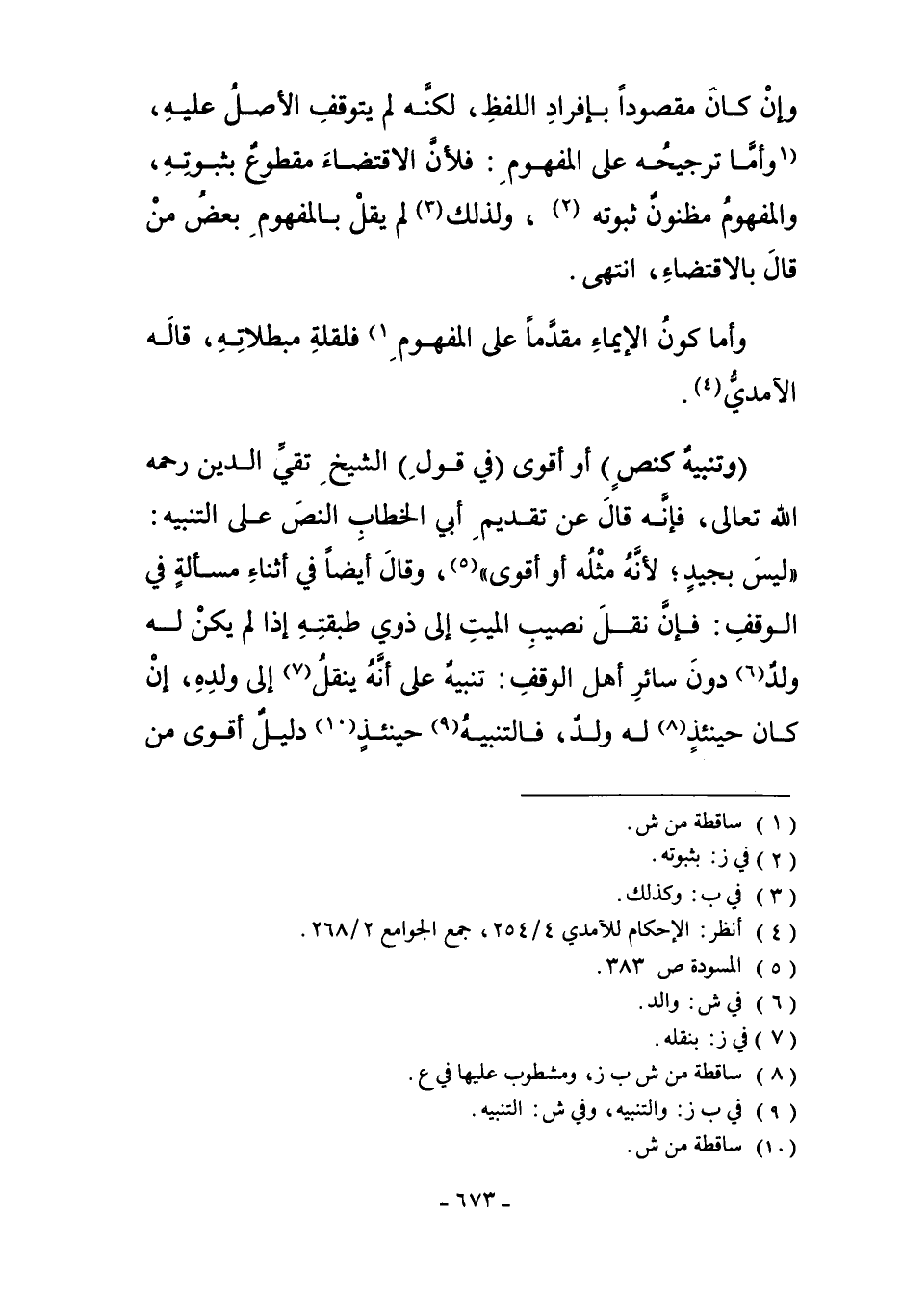 "وَتَنْبِيهٌ كَنَصٍّ" أَوْ أَقْوَى "فِي قَوْلِ" الشَّيْخِ تَقِيِّ الدِّينِ رَحِمَهُ اللَّهُ تَعَالَى، فَإِنَّهُ قَالَ عَنْ تَقْدِيمِ أَبِي الْخَطَّابِ النَّصَّ عَلَى التَّنْبِيهِ: لَيْسَ بِجَيِّدٍ؛ لأَنَّهُ مِثْلُهُ أَوْ أَقْوَى5. وَقَالَ أَيْضًا فِي أَثْنَاءِ مَسْأَلَةٍ فِي الْوَقْفِ: فَإِنْ نَقَلَ نَصِيبَ الْمَيِّتِ إلَى ذَوِي طَبَقَتِهِ إذَا لَمْ يَكُنْ لَهُ وَلَدٌ6 دُونَ سَائِرِ أَهْلِ الْوَقْفِ: تَنْبِيهٌ عَلَى أَنَّهُ يُنْقَلُ7 إلَى وَلَدِهِ إنْ كَانَ حِينَئِذٍ8 لَهُ وَلَدٌ، فَالتَّنْبِيهُ9 حِينَئِذٍ10: دَلِيلٌ أَقْوَى مِنْ