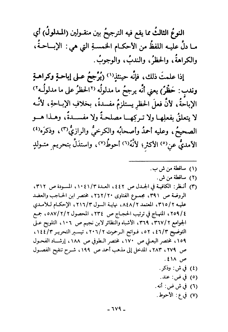 إذَا عَلِمْت ذَلِكَ. فَإِنَّهُ حِينَئِذٍ1 "يُرَجَّحُ عَلَى إبَاحَةٍ وَكَرَاهَةٍ وَنَدْبٍ: حَظْرٌ" يَعْنِي أَنَّهُ يُرَجَّحُ مَا مَدْلُولُهُ الْحَظْرُ عَلَى مَا مَدْلُولُهُ 2 الإِبَاحَةُ؛ لأَنَّ فِعْلَ الْحَظْرِ يَسْتَلْزِمُ مَفْسَدَةً، بِخِلافِ الإِبَاحَةِ، لأَنَّهُ لا يَتَعَلَّقُ بِفِعْلِهَا، وَلا تَرْكِهَا مَصْلَحَةٌ، وَلا مَفْسَدَةٌ، وَهَذَا هُوَ الصَّحِيحُ، وَعَلَيْهِ أَحْمَدُ وَأَصْحَابُهُ وَالْكَرْخِيُّ وَالرَّازِيُّ3، وَذَكَرَهُ4 الآمِدِيُّ عَنْ5 الأَكْثَرِ: لأَنَّهُ6 أَحْوَطُ7، وَاسْتَدَلَّ بِتَحْرِيمِ مُتَوَلِّدٍ