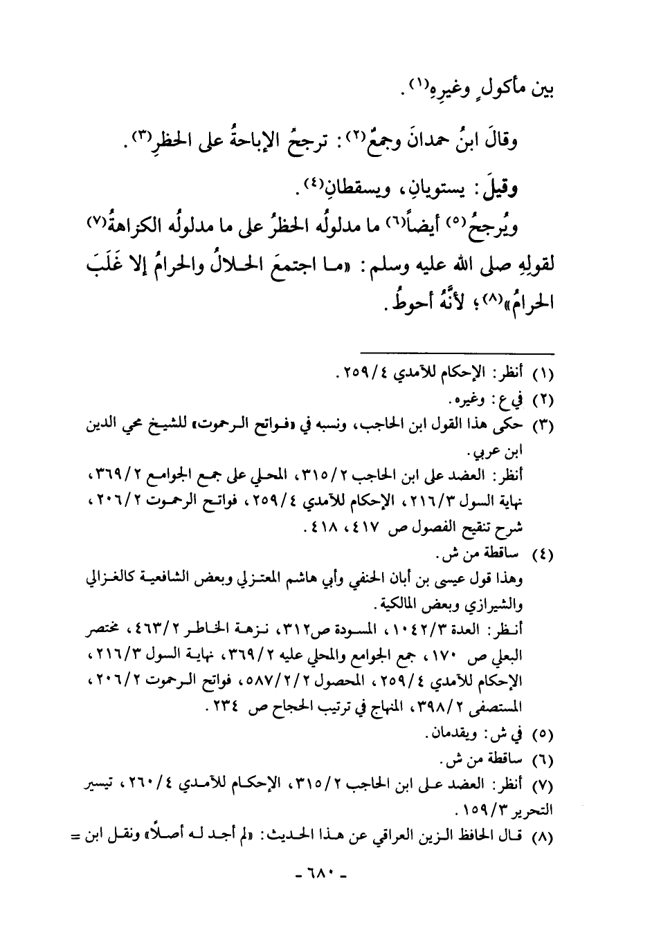 وَقَالَ ابْنُ حَمْدَانَ وَجَمْعٌ2: تُرَجَّحُ الإِبَاحَةُ عَلَى الْحَظْرِ3.