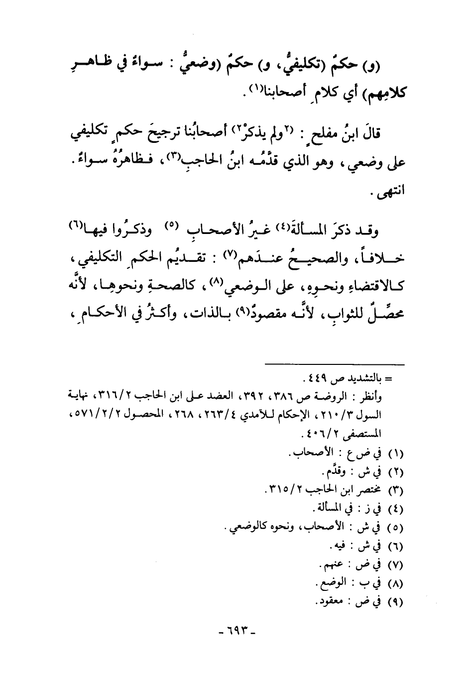 وَقَدْ ذَكَرَ الْمَسْأَلَةَ4 غَيْرُ الأَصْحَابِ5، وَذَكَرُوا فِيهَا6 خِلافًا وَالصَّحِيحُ عِنْدَهُمْ7: تَقْدِيمُ الْحُكْمِ التَّكْلِيفِيِّ، كَالاقْتِضَاءِ وَنَحْوِهِ عَلَى الْوَضْعِيِّ8، كَالصِّحَّةِ وَنَحْوِهَا؛ لأَنَّهُ مُحَصِّلٌ لِلثَّوَابِ؛ لأَنَّهُ مَقْصُودٌ9 بِالذَّاتِ وَأَكْثَرُ فِي الأَحْكَامِ،