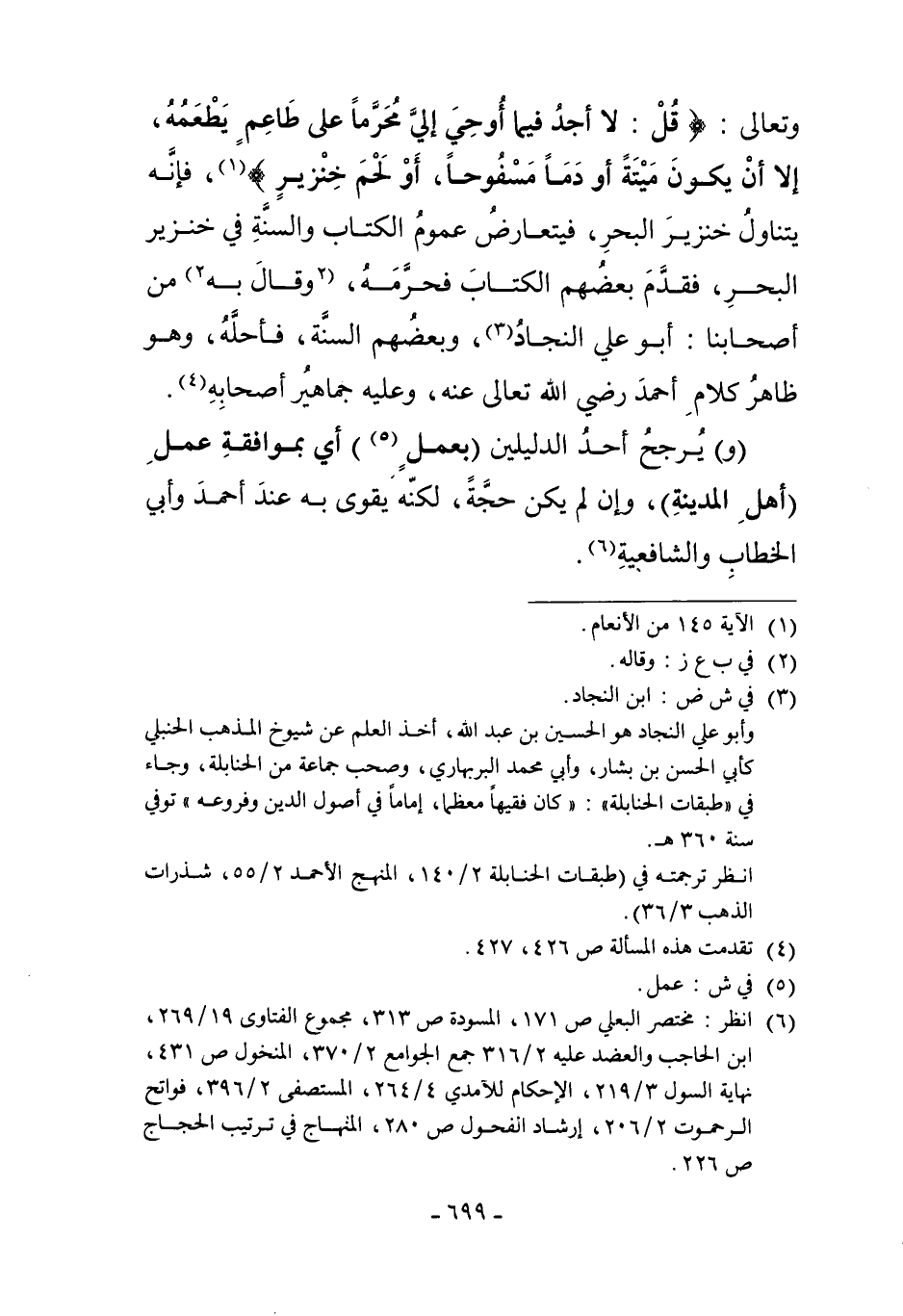 وتَعَالَى: {قُلْ لا أَجِدُ فِيمَا أُوحِيَ إلَيَّ مُحَرَّمًا عَلَى طَاعِمٍ يَطْعَمُهُ إلاَّ أَنْ يَكُونَ مَيْتَةً أَوْ دَمًا مَسْفُوحًا أَوْ لَحْمَ خِنْزِيرٍ} 1 فَإِنَّهُ يَتَنَاوَلُ خِنْزِيرَ الْبَحْرِ فَيَتَعَارَضُ عُمُومُ الْكِتَابِ وَالسُّنَّةِ فِي خِنْزِيرِ الْبَحْرِ، فَقَدَّمَ بَعْضُهُمْ الْكِتَابَ فَحَرَّمَهُ، وَقَالَ بِهِ2 مِنْ أَصْحَابِنَا: أَبُو عَلِيٍّ النَّجَّادُ3، وَبَعْضُهُمْ: السُّنَّةَ فَأَحَلَّهُ، وَهُوَ ظَاهِرُ كَلامِ أَحْمَدَ رَضِيَ اللَّهُ تَعَالَى عَنْهُ، وَعَلَيْهِ جَمَاهِيرُ أَصْحَابِهِ4.