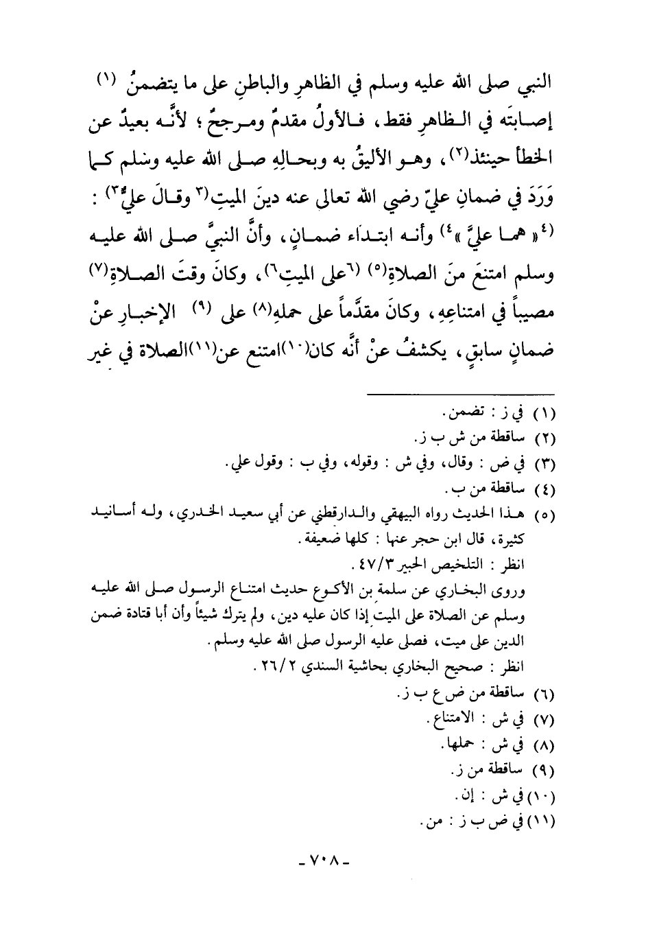 النَّبِيِّ صَلَّى اللَّهُ عَلَيْهِ وَسَلَّمَ فِي الظَّاهِرِ وَالْبَاطِنِ عَلَى مَا يَتَضَمَّنُ1 إصَابَتَهُ فِي الظَّاهِرِ فَقَطْ، فَالأَوَّلُ مُقَدَّمٌ وَمُرَجَّحٌ؛ لأَنَّهُ بَعِيدٌ عَنْ الْخَطَإِ حِينَئِذٍ2، وَهُوَ الأَلْيَقُ بِهِ وَبِحَالِهِ صَلَّى اللَّهُ عَلَيْهِ وَسَلَّمَ، كَمَا وَرَدَ فِي ضَمَانِ عَلِيٍّ رَضِيَ اللَّهُ تَعَالَى عَنْهُ: دَيْنَ الْمَيِّتِ وَقَالَ عَلِيٌّ3 " هُمَا عَلَيَّ "4 وَأَنَّهُ ابْتِدَاءُ ضَمَانٍ، وَأَنَّ النَّبِيَّ صَلَّى اللَّهُ عَلَيْهِ وَسَلَّمَ امْتَنَعَ مِنْ الصَّلاةِ5 عَلَى الْمَيِّتِ6، وَكَانَ وَقْتَ الصَّلاةِ7 مُصِيبًا فِي امْتِنَاعِهِ، وَكَانَ مُقَدَّمًا عَلَى حَمْلِهِ8 عَلَى9 الإِخْبَارِ عَنْ ضَمَانٍ سَابِقٍ، يَكْشِفُ عَنْ أَنَّهُ كَانَ10 امْتَنَعَ عَنْ11 الصَّلاةِ فِي غَيْرِ
