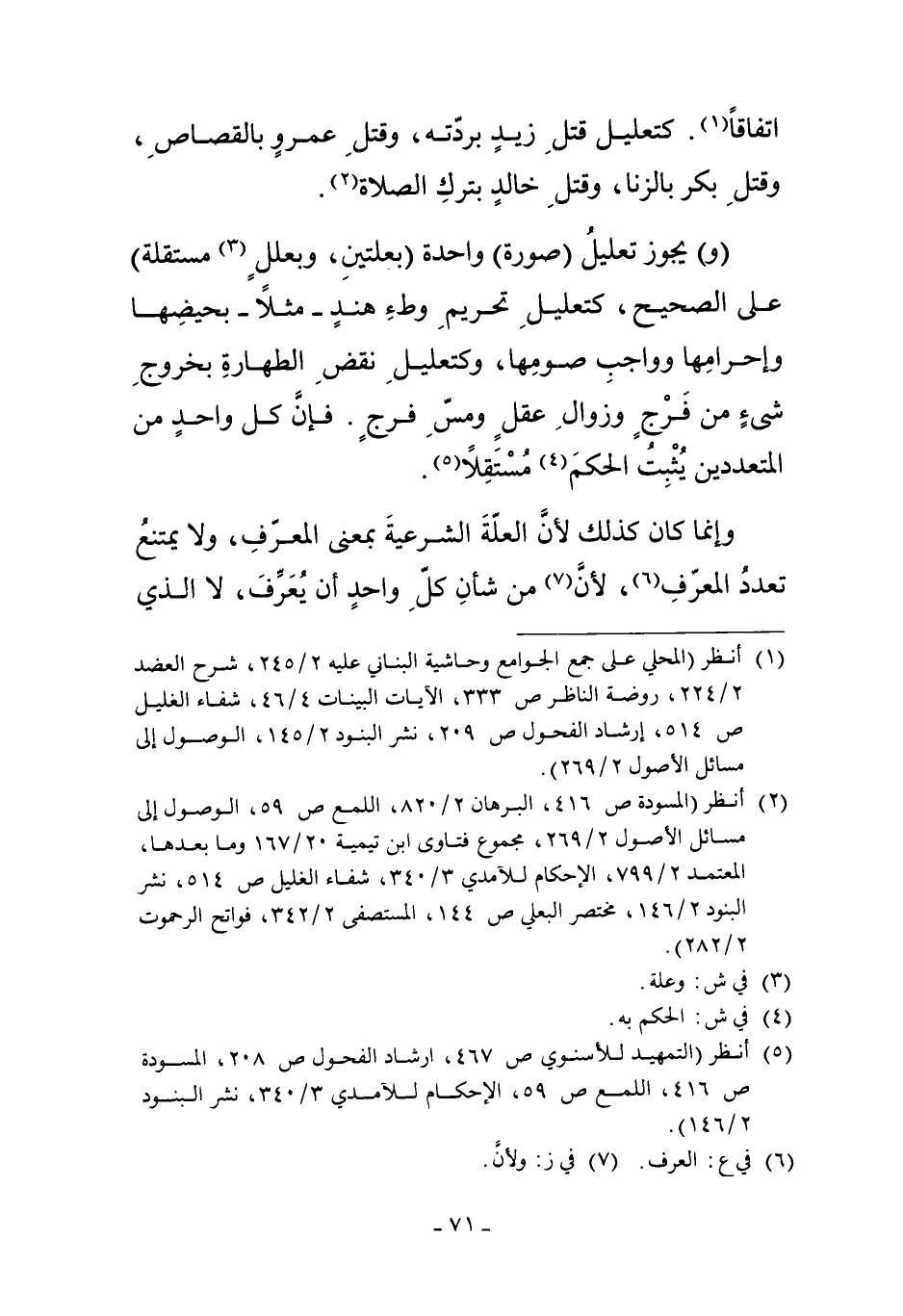 وَإِنَّمَا كَانَ كَذَلِكَ لأَنَّ الْعِلَّةَ الشَّرْعِيَّةَ بِمَعْنَى الْمُعَرِّفِ6، وَلا يَمْتَنِعُ تَعَدُّدُ الْمُعَرِّفِ؛ لأَنَّ7 مِنْ شَأْنِ كُلِّ وَاحِدٍ أَنْ يُعْرَفَ، لا الَّذِي