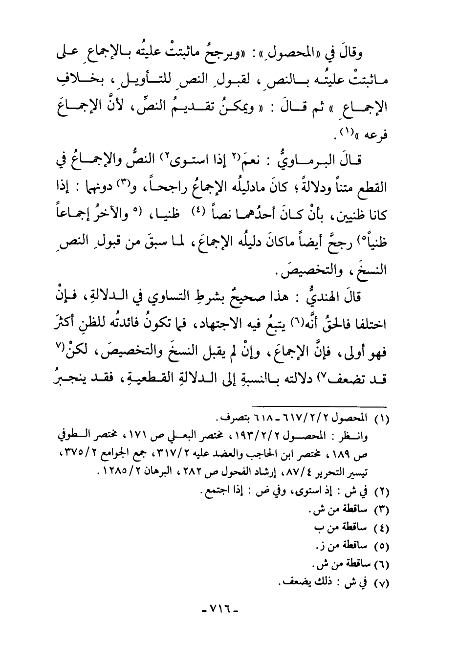 قَالَ الْهِنْدِيُّ: هَذَا صَحِيحٌ بِشَرْطِ التَّسَاوِي فِي الدَّلالَةِ، فَإِنْ اخْتَلَفَا فَالْحَقُّ أَنَّهُ6 يُتْبَعُ فِيهِ الاجْتِهَادُ فَمَا تَكُونُ فَائِدَتُهُ لِلظَّنِّ أَكْثَرَ: فَهُوَ أَوْلَى فَإِنَّ الإِجْمَاعَ، وَإِنْ لَمْ يَقْبَلْ النَّسْخَ وَالتَّخْصِيصَ، لَكِنْ قَدْ تَضْعُفُ7 دَلالَتُهُ بِالنِّسْبَةِ إلَى الدَّلالَةِ الْقَطْعِيَّةِ، فَقَدْ يَنْجَبِرُ