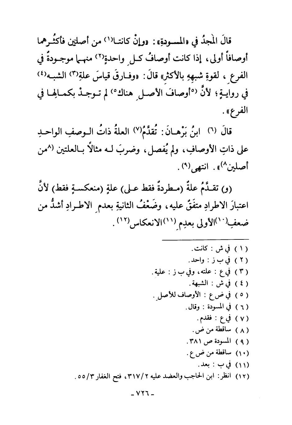 قَالَ6 ابْنُ بُرْهَانٍ: تُقَدَّمُ7 الْعِلَّةُ ذَاتُ الْوَصْفِ الْوَاحِدِ عَلَى ذَاتِ الأَوْصَافِ. وَلَمْ يُفَصِّلْ، وَضَرَبَ لَهُ مِثَالاً بِالْعِلَّتَيْنِ مِنْ أَصْلَيْنِ8. انْتَهَى9.