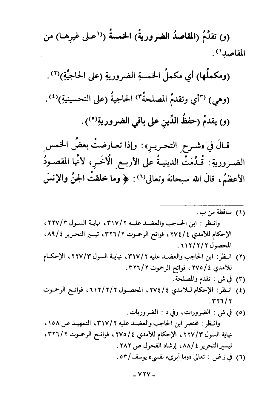 "وَ" تُقَدَّمُ "الْمَقَاصِدُ الضَّرُورِيَّةُ" الْخَمْسَةُ "عَلَى غَيْرِهَا" مِنْ الْمَقَاصِدِ1.