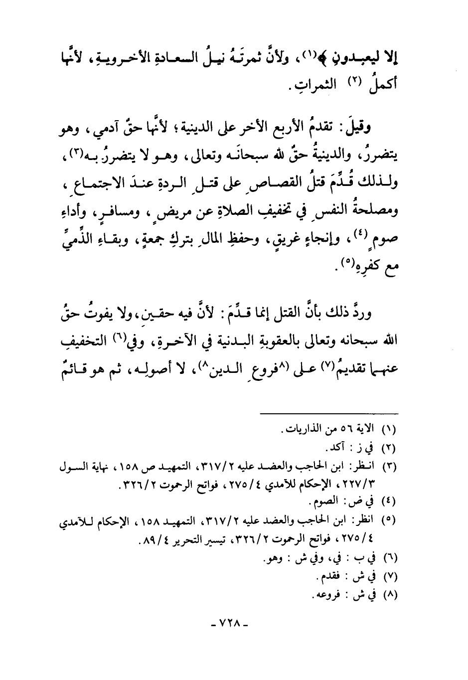 وَقِيلَ: تُقَدَّمُ الأَرْبَعُ الأُخَرُ عَلَى الدِّينِيَّةِ؛ لأَنَّهَا حَقٌّ آدَمِيٌّ، وَهُوَ يَتَضَرَّرُ. وَالدِّينِيَّةُ حَقٌّ لِلَّهِ سُبْحَانَهُ وَتَعَالَى، وَهُوَ لا يَتَضَرَّرُ بِهِ3، وَلِذَلِكَ قُدِّمَ قَتْلُ الْقِصَاصِ عَلَى قَتْلِ الرِّدَّةِ عِنْدَ الاجْتِمَاعِ، وَمَصْلَحَةُ النَّفْسِ فِي تَخْفِيفِ الصَّلاةِ عَنْ مَرِيضٍ، وَمُسَافِرٍ، وَأَدَاءِ صَوْمٍ4، وَإِنْجَاءِ غَرِيقٍ، وَحِفْظِ الْمَالِ بِتَرْكِ جُمُعَةٍ، وَبَقَاءِ الذِّمِّيِّ مَعَ كُفْرِهِ5.