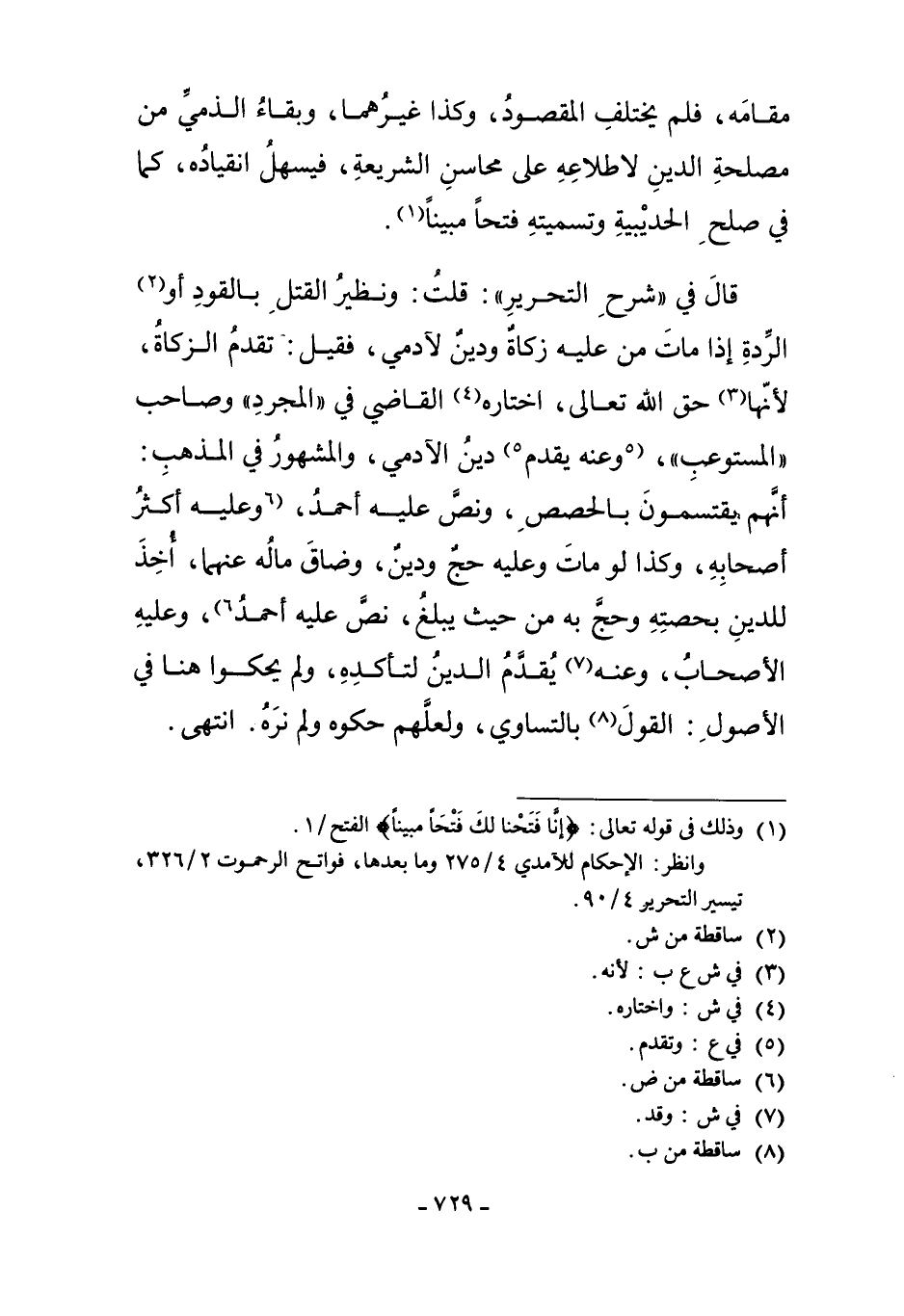 قَالَ فِي شَرْحِ التَّحْرِيرِ قُلْت: وَنَظِيرُ الْقَتْلِ بِالْقَوَدِ أَوْ2 الرِّدَّةِ إذَا مَاتَ مَنْ عَلَيْهِ زَكَاةٌ وَدَيْنٌ لآدَمِيٍّ، فَقِيلَ: تُقَدَّمُ الزَّكَاةُ؛ لأَنَّهَا3 حَقُّ اللَّهِ تَعَالَى اخْتَارَهُ4 الْقَاضِي فِي الْمُجَرَّدِ وَصَاحِبِ الْمُسْتَوْعِبِ وَعَنْهُ يُقَدَّمُ5 دَيْنُ الآدَمِيِّ. وَالْمَشْهُورُ فِي الْمَذْهَبِ: أَنَّهُمْ يَقْتَسِمُونَ بِالْحِصَصِ، وَنَصَّ عَلَيْهِ أَحْمَدُ، وَعَلَيْهِ أَكْثَرُ أَصْحَابِهِ، وَكَذَا لَوْ مَاتَ، وَعَلَيْهِ حَجٌّ، وَدَيْنٌ، وَضَاقَ مَالُهُ عَنْهُمَا. أُخِذَ لِلدَّيْنِ بِحِصَّتِهِ وَحَجُّ بِهِ مِنْ حَيْثُ يَبْلُغُ، نَصَّ عَلَيْهِ أَحْمَدُ6، وَعَلَيْهِ الأَصْحَابُ، وَعَنْهُ7 يُقَدَّمُ الدَّيْنُ لِتَأَكُّدِهِ، وَلَمْ يَحْكُوا هُنَا فِي الأُصُولِ: الْقَوْلَ8 بِالتَّسَاوِي، وَلَعَلَّهُمْ حَكَوْهُ وَلَمْ نَرَهُ. انْتَهَى.