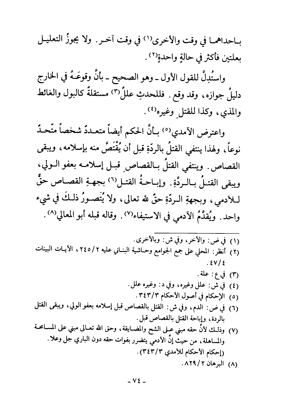 بِإِحْدَاهُمَا فِي وَقْتٍ وَالأُخْرَى1 فِي وَقْتٍ آخَرَ. وَلا يَجُوزُ التَّعْلِيلُ بِعِلَّتَيْنِ فَأَكْثَرَ فِي حَالَةٍ وَاحِدَةٍ2. وَاسْتُدِلَّ لِلْقَوْلِ الأَوَّلِ - وَهُوَ الصَّحِيحُ - بِأَنَّ وُقُوعَهُ فِي الْخَارِجِ دَلِيلُ جَوَازِهِ، وَقَدْ وَقَعَ. فَلِلْحَدَثِ عِلَلٌ3 مُسْتَقِلَّةٌ كَالْبَوْلِ وَالْغَائِطِ وَالْمَذْيِ، وَكَذَا لِلْقَتْلِ لِلْقَتْلِ وَغَيْرِهِ4.