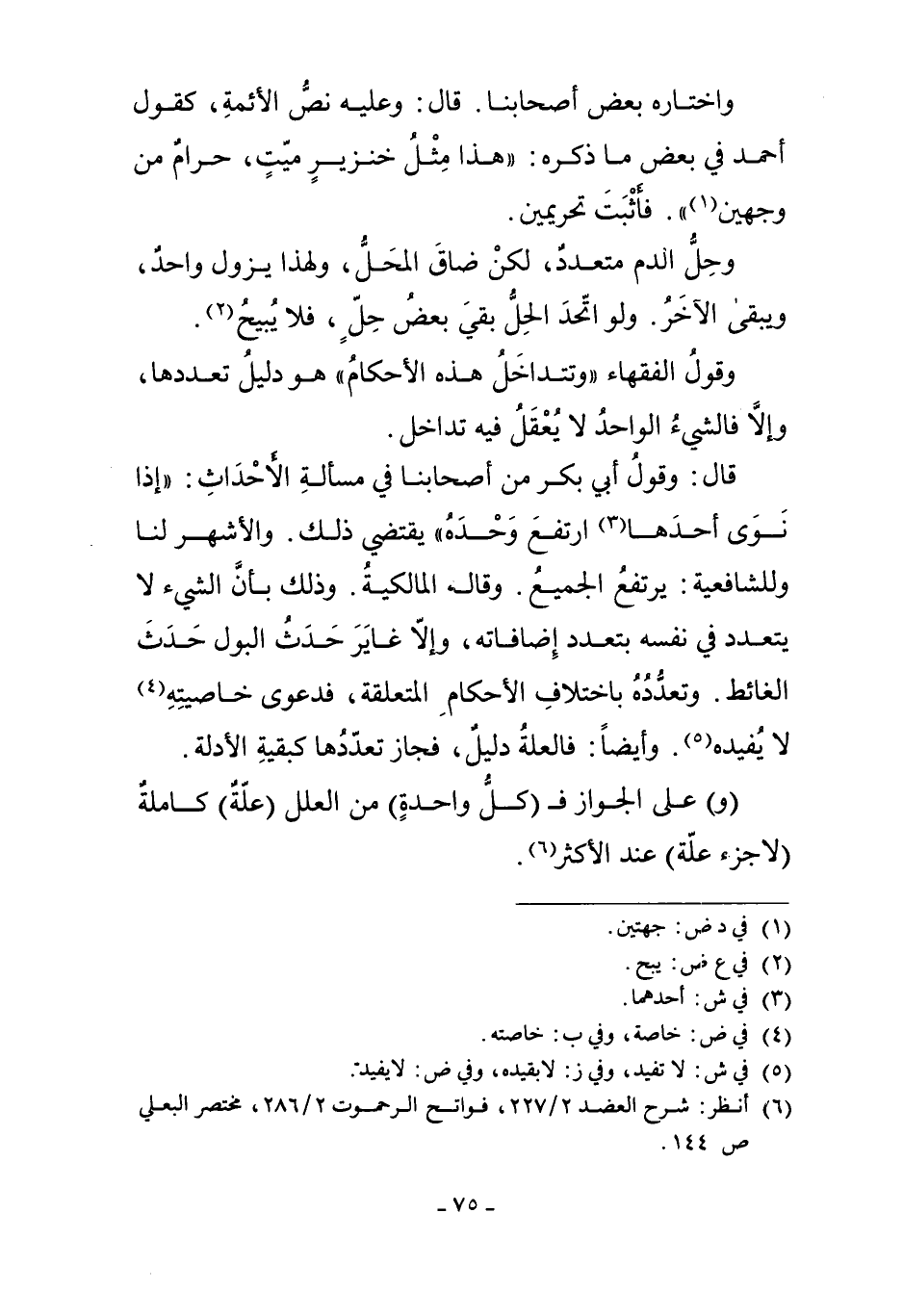 قَالَ: وَقَوْلُ أَبِي بَكْرٍ مِنْ أَصْحَابِنَا فِي مَسْأَلَةِ الأَحْدَاثِ: إذَا نَوَى أَحَدَهَا3 ارْتَفَعَ وَحْدَهُ، يَقْتَضِي ذَلِكَ. وَالأَشْهَرُ لَنَا وَلِلشَّافِعِيَّةِ: يَرْتَفِعُ الْجَمِيعُ. وَقَالَهُ الْمَالِكِيَّةُ، وَذَلِكَ بِأَنَّ الشَّيْءَ لا يَتَعَدَّدُ فِي نَفْسِهِ بِتَعَدُّدِ إضَافَاتِهِ، وَإِلاَّ غَايَرَ حَدَثُ الْبَوْلِ حَدَثَ الْغَائِطِ، وَتَعَدُّدُهُ بِاخْتِلافِ الأَحْكَامِ الْمُتَعَلِّقَةِ، فَدَعْوَى خَاصِّيَّتِهِ4 لا يُفِيدُهُ5. وَأَيْضًا فَالْعِلَّةُ دَلِيلٌ، فَجَازَ تَعَدُّدُهَا كَبَقِيَّةِ الأَدِلَّةِ.
