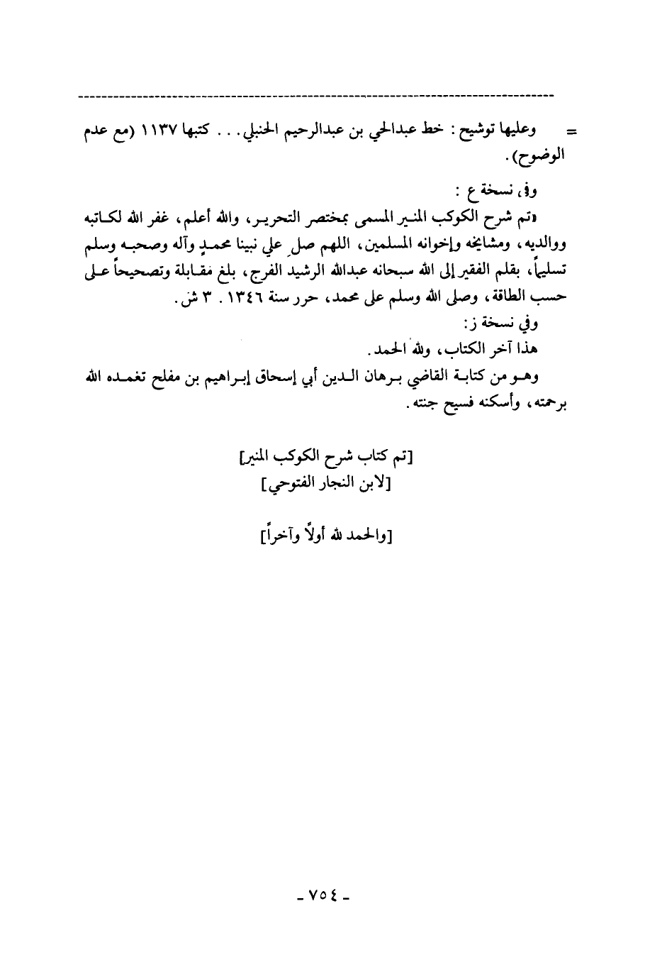 "تم شرح الكوكب المنير المسمى بمختصر التحرير، والله أعلم، غفر لكاتبه ووالديه، ومشايخه وإخوانه المسلمين، اللهم صل على نبينا محمد وآله وصحبه وسلم وتسليماً، بقلم الفقير إلى سبحانه عبد الله الرشيد الفرج، بلغ مقابلةوتصحيحاً على حسب الطاقة، وصلى الله وسلم على محمد، حرر سنة 1346. 3ش.