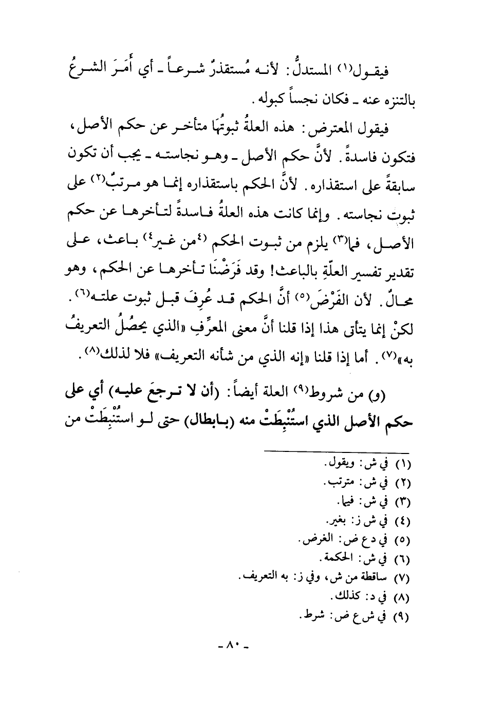 "وَ" مِنْ شُرُوطِ9 الْعِلَّةِ أَيْضًا "أَنْ لا تَرْجِعَ عَلَيْهِ" أَيْ عَلَى حُكْمِ الأَصْلِ الَّذِي اُسْتُنْبِطَتْ مِنْهُ "بِإِبْطَالٍ" حَتَّى لَوْ اُسْتُنْبِطَتْ مِنْ