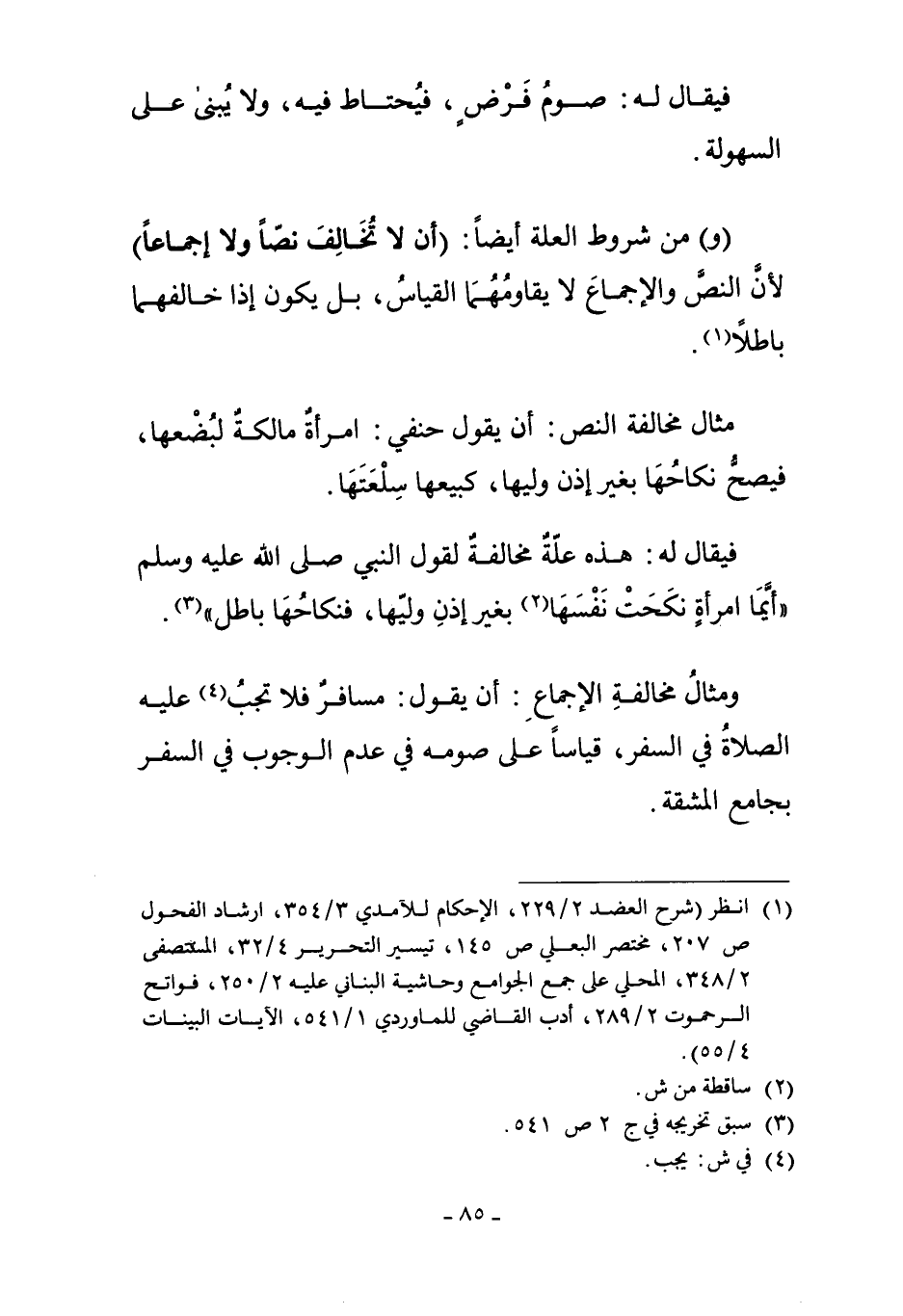 "وَ" مِنْ شُرُوطِ الْعِلَّةِ أَيْضًا "أَنْ لا تُخَالِفَ نَصًّا وَلا إجْمَاعًا"؛ لأَنَّ النَّصَّ وَالإِجْمَاعَ لا يُقَاوِمُهُمَا الْقِيَاسُ، بَلْ يَكُونُ إذَا خَالَفَهُمَا بَاطِلاً1.