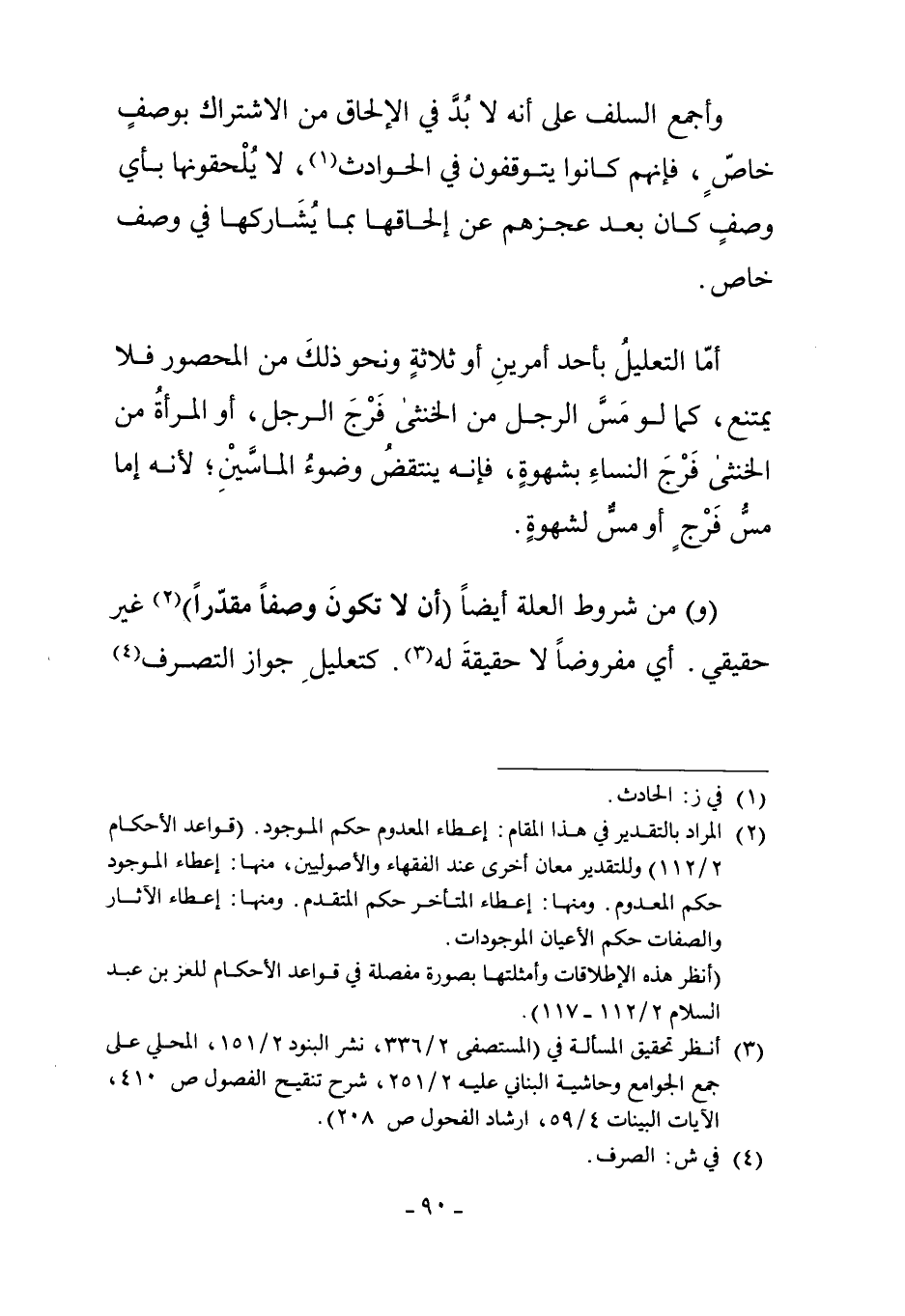 "وَ" مِنْ شُرُوطِ الْعِلَّةِ أَيْضًا "أَنْ لا تَكُونَ وَصْفًا مُقَدَّرًا2" غَيْرَ حَقِيقِيٍّ، أَيْ مَفْرُوضًا لا حَقِيقَةَ لَهُ3، كَتَعْلِيلِ جَوَازِ التَّصَرُّفِ4