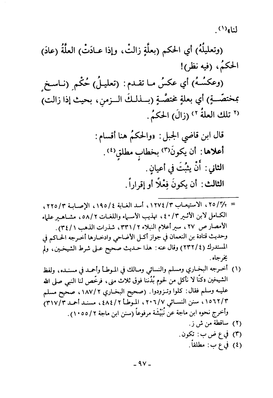 "وَعَكْسُهُ" أَيْ عَكْسُ مَا تَقَدَّمَ تَعْلِيلُ حُكْمٍ نَاسِخٍ بِمُخْتَصَّةٍ أَيْ بِعِلَّةٍ مُخْتَصَّةٍ بِذَلِكَ الزَّمَنِ، بِحَيْثُ إذَا زَالَتْ 2تِلْكَ الْعِلَّةُ "زَالَ" الْحُكْمُ.