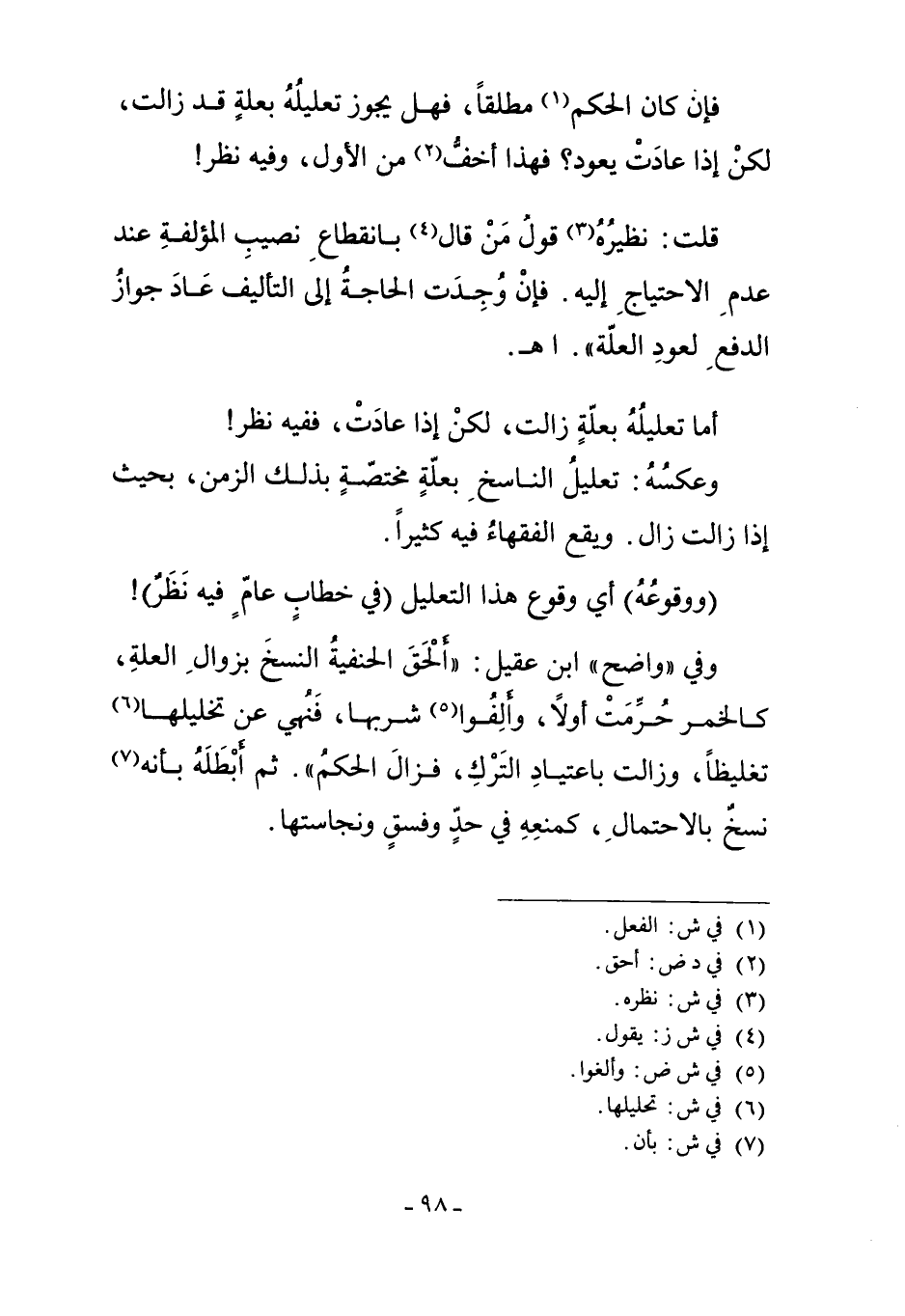 وَفِي وَاضِحِ ابْنِ عَقِيلٍ: أَلْحَقَ الْحَنَفِيَّةُ النَّسْخَ بِزَوَالِ الْعِلَّةِ، كَالْخَمْرِ حُرِّمَتْ أَوَّلاً وَأَلِفُوا5 شُرْبَهَا، فَنُهِيَ عَنْ تَخْلِيلِهَا6 تَغْلِيظًا، وَزَالَتْ بِاعْتِيَادِ التَّرْكِ، فَزَالَ الْحُكْمُ، ثُمَّ أَبْطَلَهُ بِأَنَّهُ7 نَسْخٌ بِالاحْتِمَالِ كَمَنْعِهِ فِي حَدٍّ وَفِسْقٍ وَنَجَاسَتِهَا.