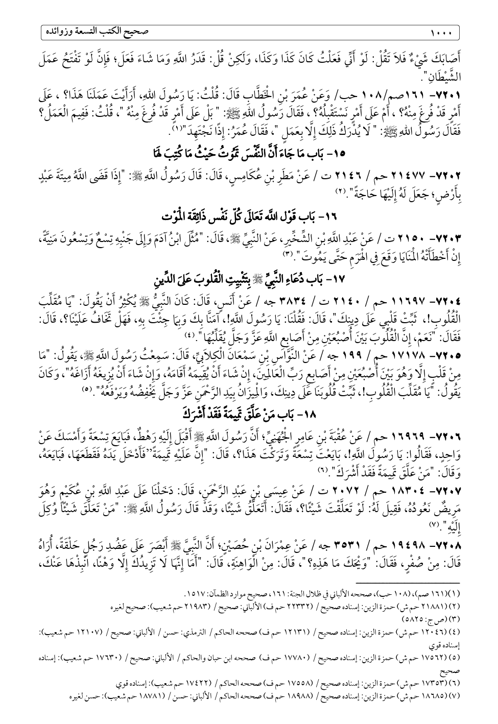 ٧٢٠٥ - ١٧١٧٨ حم / ١٩٩ جه / عَنْ النَّوَّاسِ بْنِ سَمْعَانَ الْكِلَابِيِّ، قَالَ: سَمِعْتُ رَسُولَ اللَّهِ - صلى الله عليه وسلم -، يَقُولُ: "مَا مِنْ قَلْبٍ إِلَّا وَهُوَ بَيْنَ أُصْبُعَيْنِ مِنْ أَصَابِعِ رَبِّ الْعَالَمِينَ، إِنْ شَاءَ أَنْ يُقِيمَهُ أَقَامَهُ، وَإِنْ شَاءَ أَنْ يُزِيغَهُ أَزَاغَهُ"، وَكَانَ يَقُولُ: "يَا مُقَلِّبَ الْقُلُوبِ!، ثَبِّتْ قُلُوبَنَا عَلَى دِينِكَ، وَالْمِيزَانُ بِيَدِ الرَّحْمَنِ عَزَّ وَجَلَّ يَخْفِضُهُ وَيَرْفَعُهُ". (¬٥)