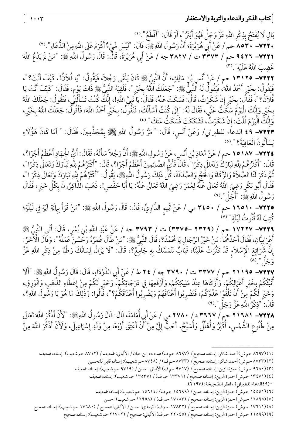 ٧٢٢٧ - ٢١١٩٥ حم / ٣٣٧٧ ت / ٣٧٩٠ جه / ٢٤ ط / عَنْ أَبِي الدَّرْدَاءِ، قَالَ: قَالَ رَسُولُ اللَّهِ - صلى الله عليه وسلم -: "أَلَا أُنَبِّئُكُمْ بِخَيْرِ أَعْمَالِكُمْ، وَأَزْكَاهَا عِنْدَ مَلِيكِكُمْ، وَأَرْفَعِهَا فِي دَرَجَاتِكُمْ، وَخَيْرٍ لَكُمْ مِنْ إِعْطَاءِ الذَّهَبِ وَالْوَرِقِ، وَخَيْرٍ لَكُمْ مِنْ أَنْ تَلْقَوْا عَدُوَّكُمْ، فَتَضْرِبُوا أَعْنَاقَهُمْ وَيَضْرِبُوا أَعْنَاقَكُمْ؟ "، قَالُوا: وَذَلِكَ مَا هُوَ يَا رَسُولَ اللَّهِ؟، قَالَ: "ذِكْرُ اللَّهِ عَزَّ وَجَلَّ". (¬٩)