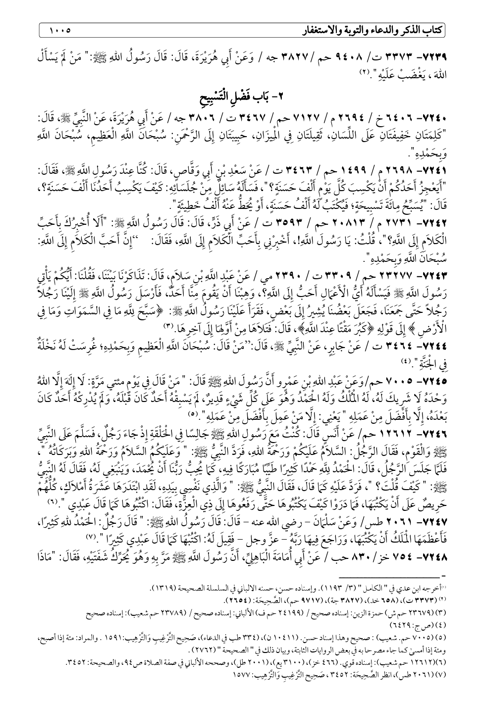 ٧٢٤١ - ٢٦٩٨ م / ١٤٩٩ حم / ٣٤٦٣ ت / عَنْ سَعْدِ بْنِ أَبِي وَقَّاصٍ، قَالَ: كُنَّا عِنْدَ رَسُولِ اللَّهِ - صلى الله عليه وسلم -، فَقَالَ: "أَيَعْجِزُ أَحَدُكُمْ أَنْ يَكْسِبَ كُلَّ يَوْمٍ أَلْفَ حَسَنَةٍ؟ "، فَسَأَلَهُ سَائِلٌ مِنْ جُلَسَائِهِ: كَيْفَ يَكْسِبُ أَحَدُنَا أَلْفَ حَسَنَةٍ؟، قَالَ: "يُسَبِّحُ مِائَةَ تَسْبِيحَةٍ؛ فَيُكْتَبُ لَهُ أَلْفُ حَسَنَةٍ، أَوْ يُحَطُّ عَنْهُ أَلْفُ خَطِيئَةٍ".