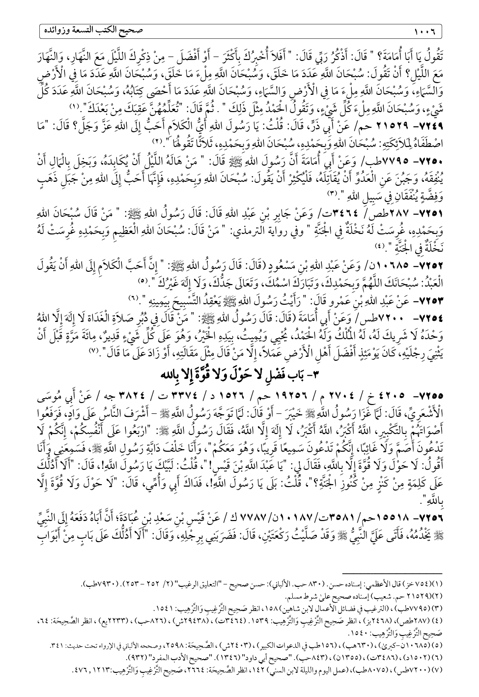 ٧٢٥٥ - ٤٢٠٥ خ / ٢٧٠٤ م / ١٩٢٥٦ حم / ١٥٢٦ د / ٣٣٧٤ ت / ٣٨٢٤ جه / عَنْ أَبِي مُوسَى الْأَشْعَرِيِّ، قَالَ: لَمَّا غَزَا رَسُولُ اللَّهِ - صلى الله عليه وسلم - خَيْبَرَ - أَوْ قَالَ: لَمَّا تَوَجَّهَ رَسُولُ اللَّهِ - صلى الله عليه وسلم - أَشْرَفَ النَّاسُ عَلَى وَادٍ، فَرَفَعُوا أَصْوَاتَهُمْ بِالتَّكْبِيرِ، اللَّهُ أَكْبَرُ، اللَّهُ أَكْبَرُ، لَا إِلَهَ إِلَّا اللَّهُ، فَقَالَ رَسُولُ اللَّهِ - صلى الله عليه وسلم -: "ارْبَعُوا عَلَى أَنْفُسِكُمْ، إِنَّكُمْ لَا تَدْعُونَ أَصَمَّ وَلَا غَائِبًا، إِنَّكُمْ تَدْعُونَ سَمِيعًا قَرِيبًا، وَهُوَ مَعَكُمْ"، وَأَنَا خَلْفَ دَابَّةِ رَسُولِ اللَّهِ - صلى الله عليه وسلم -، فَسَمِعَنِي وَأَنَا أَقُولُ: لَا حَوْلَ وَلَا قُوَّةَ إِلَّا بِاللَّهِ، فَقَالَ لِي: "يَا عَبْدَ اللَّهِ بْنَ قَيْسٍ! "، قُلْتُ: لَبَّيْكَ يَا رَسُولَ اللَّهِ!، قَالَ: "أَلَا أَدُلُّكَ عَلَى كَلِمَةٍ مِنْ كَنْزٍ مِنْ كُنُوزِ الْجَنَّةِ؟ "، قُلْتُ: بَلَى يَا رَسُولَ اللَّهِ!، فَدَاكَ أَبِي وَأُمِّي، قَالَ: "لَا حَوْلَ وَلَا قُوَّةَ إِلَّا بِاللَّهِ".