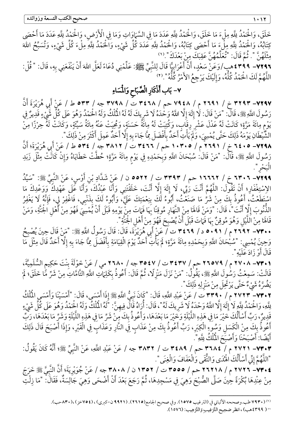 ٧٣٠٠ - ٢٦٩٢ م / ٥٠٩١ د / ٣٤٦٩ ت / عَنْ أَبِي هُرَيْرَةَ، قَالَ: قَالَ رَسُولُ اللَّهِ - صلى الله عليه وسلم -: "مَنْ قَالَ حِينَ يُصْبِحُ وَحِينَ يُمْسِي: "سُبْحَانَ اللَّهِ وَبِحَمْدِهِ مِائَةَ مَرَّةٍ؛ لَمْ يَأْتِ أَحَدٌ يَوْمَ الْقِيَامَةِ بِأَفْضَلَ مِمَّا جَاءَ بِهِ إِلَّا أَحَدٌ قَالَ مِثْلَ مَا قَالَ أَوْ زَادَ عَلَيْهِ".