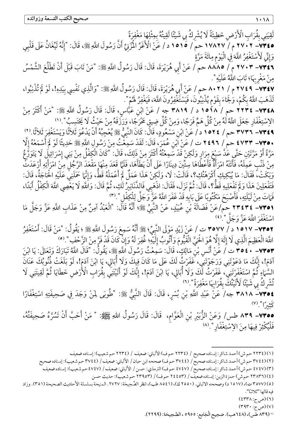 ٧٣٥٢ - ١٥١٧ د / ٣٥٧٧ ت / عَنْ زَيْدٍ مَوْلَى النَّبِيِّ؛ - صلى الله عليه وسلم - أَنَّهُ سَمِعَ رَسُولَ اللَّهِ - صلى الله عليه وسلم -؛ يَقُولُ: "مَنْ قَالَ: أَسْتَغْفِرُ اللَّهَ الْعَظِيمَ الَّذِي لَا إِلَهَ إِلَّا هُوَ الْحَيَّ الْقَيُّومَ وَأَتُوبُ إِلَيْهِ؛ غُفِرَ لَهُ وَإِنْ كَانَ قَدْ فَرَّ مِنْ الزَّحْفِ". (¬٥)