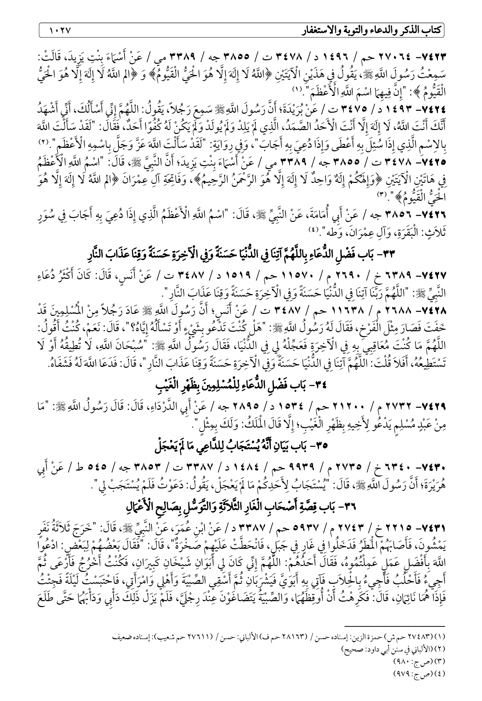 ٧٤٢٦ - ٣٨٥٦ جه / عَنْ أَبِي أُمَامَةَ، عَنْ النَّبِيِّ - صلى الله عليه وسلم -، قَالَ: "اسْمُ اللَّهِ الْأَعْظَمُ الَّذِي إِذَا دُعِيَ بِهِ أَجَابَ فِي سُوَرٍ ثَلَاثٍ: الْبَقَرَةِ، وَآلِ عِمْرَانَ، وَطه". (¬٤)