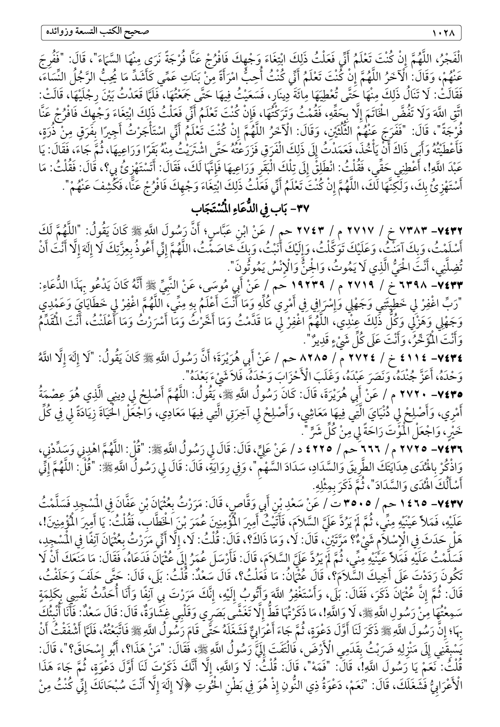 ٧٤٣٥ - ٢٧٢٠ م / عَنْ أَبِي هُرَيْرَةَ، قَالَ: كَانَ رَسُولُ اللَّهِ - صلى الله عليه وسلم -، يَقُولُ: اللَّهُمَّ أَصْلِحْ لِي دِينِي الَّذِي هُوَ عِصْمَةُ أَمْرِي، وَأَصْلِحْ لِي دُنْيَايَ الَّتِي فِيهَا مَعَاشِي، وَأَصْلِحْ لِي آخِرَتِي الَّتِي فِيهَا مَعَادِي، وَاجْعَلْ الْحَيَاةَ زِيَادَةً لِي فِي كُلِّ خَيْرٍ، وَاجْعَلْ الْمَوْتَ رَاحَةً لِي مِنْ كُلِّ شَرٍّ".