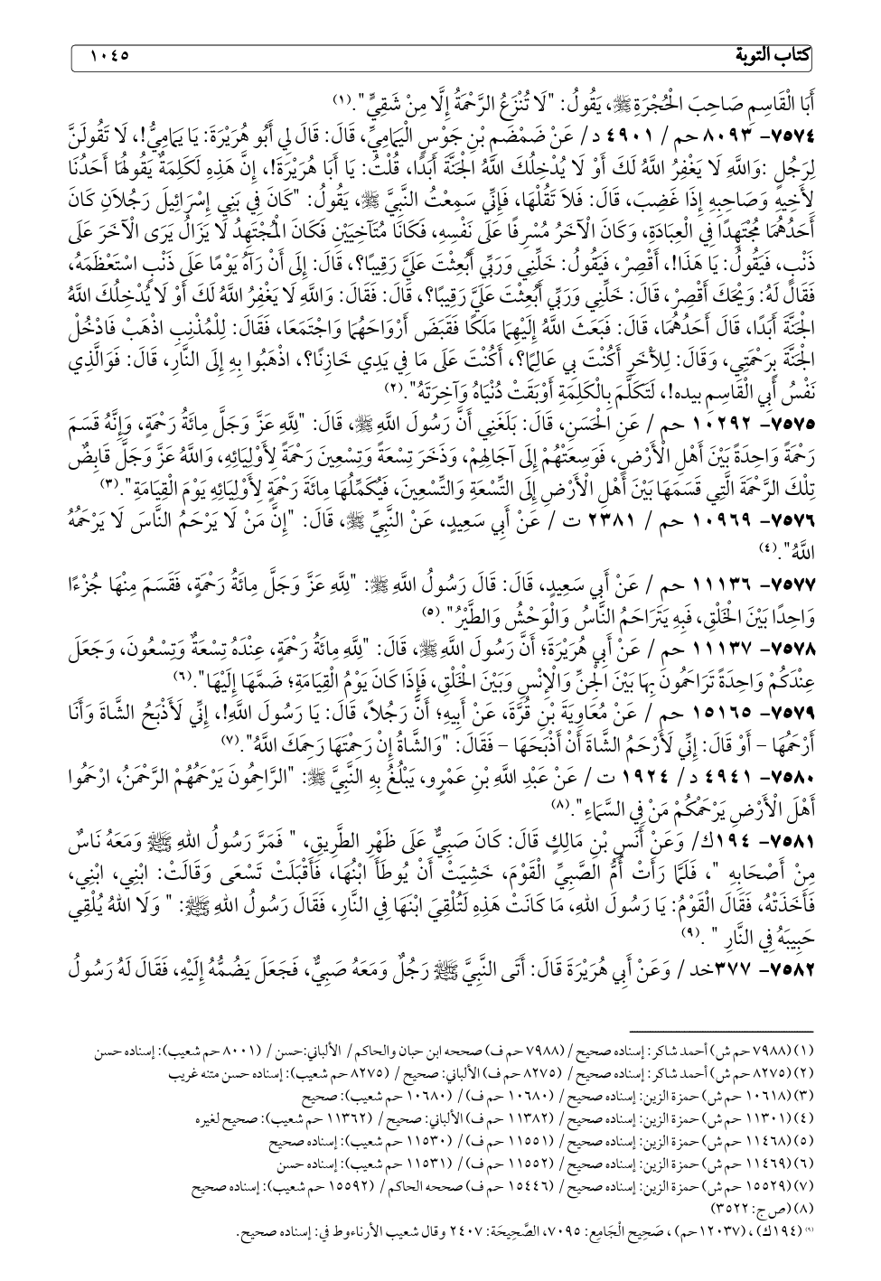 ٧٥٨٠ - ٤٩٤١ د / ١٩٢٤ ت / عَنْ عَبْدِ اللَّهِ بْنِ عَمْرٍو، يَبْلُغُ بِهِ النَّبِيَّ - صلى الله عليه وسلم -: "الرَّاحِمُونَ يَرْحَمُهُمْ الرَّحْمَنُ، ارْحَمُوا أَهْلَ الْأَرْضِ يَرْحَمْكُمْ مَنْ فِي السَّمَاءِ". (¬٨)