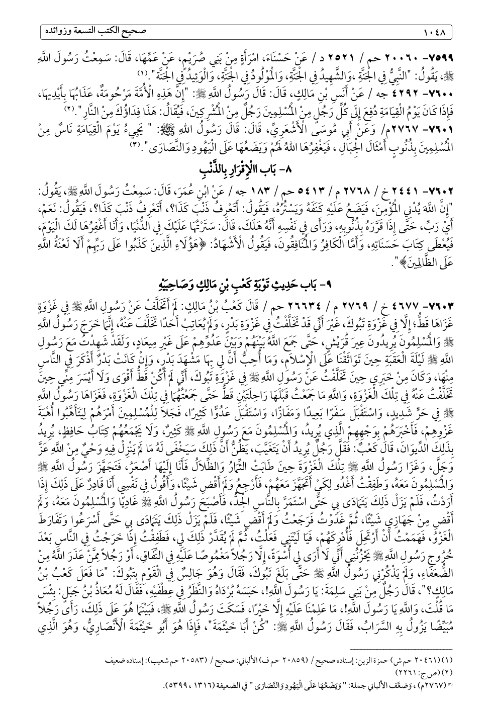 ٧٦٠٣ - ٤٦٧٧ خ / ٢٧٦٩ م / ٢٦٦٣٤ حم / قَالَ كَعْبُ بْنُ مَالِكٍ: لَمْ أَتَخَلَّفْ عَنْ رَسُولِ اللَّهِ - صلى الله عليه وسلم - فِي غَزْوَةٍ غَزَاهَا قَطُّ؛ إِلَّا فِي غَزْوَةِ تَبُوكَ، غَيْرَ أَنِّي قَدْ تَخَلَّفْتُ فِي غَزْوَةِ بَدْرٍ، وَلَمْ يُعَاتِبْ أَحَدًا تَخَلَّفَ عَنْهُ، إِنَّمَا خَرَجَ رَسُولُ اللَّهِ - صلى الله عليه وسلم - وَالْمُسْلِمُونَ يُرِيدُونَ عِيرَ قُرَيْشٍ، حَتَّى جَمَعَ اللَّهُ بَيْنَهُمْ وَبَيْنَ عَدُوِّهِمْ عَلَى غَيْرِ مِيعَادٍ، وَلَقَدْ شَهِدْتُ مَعَ رَسُولِ اللَّهِ - صلى الله عليه وسلم - لَيْلَةَ الْعَقَبَةِ حِينَ تَوَاثَقْنَا عَلَى الْإِسْلَامِ، وَمَا أُحِبُّ أَنَّ لِي بِهَا مَشْهَدَ بَدْرٍ، وَإِنْ كَانَتْ بَدْرٌ أَذْكَرَ فِي النَّاسِ مِنْهَا، وَكَانَ مِنْ خَبَرِي حِينَ تَخَلَّفْتُ عَنْ رَسُولِ اللَّهِ - صلى الله عليه وسلم - فِي غَزْوَةِ تَبُوكَ، أَنِّي لَمْ أَكُنْ قَطُّ أَقْوَى وَلَا أَيْسَرَ مِنِّي حِينَ تَخَلَّفْتُ عَنْهُ فِي تِلْكَ الْغَزْوَةِ، وَاللَّهِ مَا جَمَعْتُ قَبْلَهَا رَاحِلَتَيْنِ قَطُّ حَتَّى جَمَعْتُهُمَا فِي تِلْكَ الْغَزْوَةِ، فَغَزَاهَا رَسُولُ اللَّهِ - صلى الله عليه وسلم - فِي حَرٍّ شَدِيدٍ، وَاسْتَقْبَلَ سَفَرًا بَعِيدًا وَمَفَازًا، وَاسْتَقْبَلَ عَدُوًّا كَثِيرًا، فَجَلَا لِلْمُسْلِمِينَ أَمْرَهُمْ لِيَتَأَهَّبُوا أُهْبَةَ غَزْوِهِمْ، فَأَخْبَرَهُمْ بِوَجْهِهِمْ الَّذِي يُرِيدُ، وَالْمُسْلِمُونَ مَعَ رَسُولِ اللَّهِ - صلى الله عليه وسلم - كَثِيرٌ، وَلَا يَجْمَعُهُمْ كِتَابُ حَافِظٍ، يُرِيدُ بِذَلِكَ الدِّيوَانَ، قَالَ كَعْبٌ: فَقَلَّ رَجُلٌ يُرِيدُ أَنْ يَتَغَيَّبَ، يَظُنُّ أَنَّ ذَلِكَ سَيَخْفَى لَهُ مَا لَمْ يَنْزِلْ فِيهِ وَحْيٌ مِنْ اللَّهِ عَزَّ وَجَلَّ، وَغَزَا رَسُولُ اللَّهِ - صلى الله عليه وسلم - تِلْكَ الْغَزْوَةَ