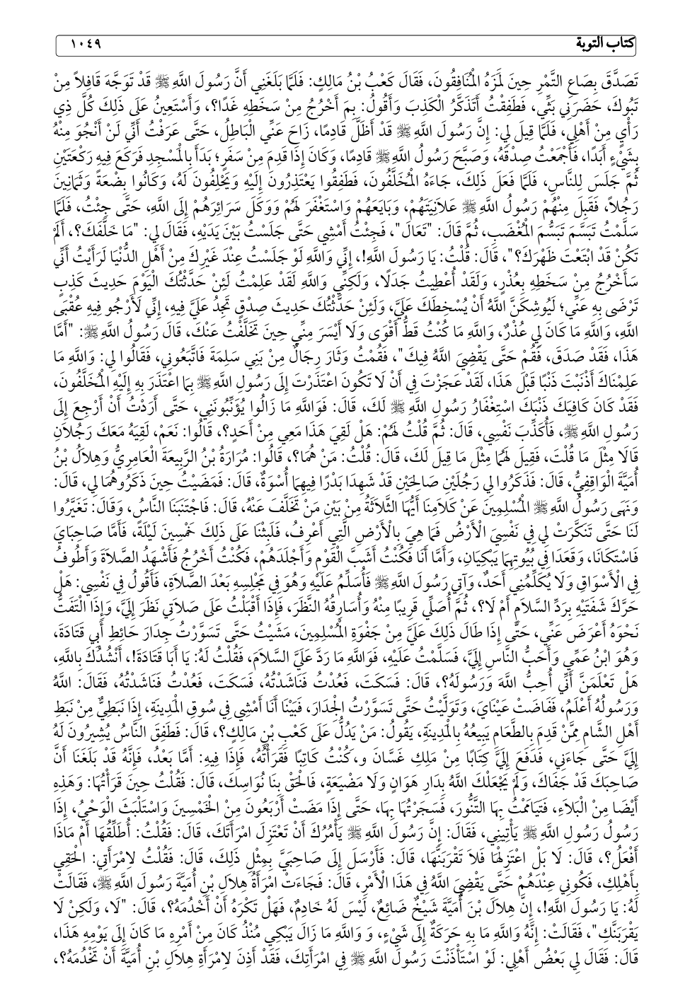 صِدْقٍ تَجِدُ عَلَيَّ فِيهِ، إِنِّي لَأَرْجُو فِيهِ عُقْبَى اللَّهِ، وَاللَّهِ مَا كَانَ لِي عُذْرٌ، وَاللَّهِ مَا كُنْتُ قَطُّ أَقْوَى وَلَا أَيْسَرَ مِنِّي حِينَ تَخَلَّفْتُ عَنْكَ، قَالَ رَسُولُ اللَّهِ - صلى الله عليه وسلم -: "أَمَّا هَذَا، فَقَدْ صَدَقَ، فَقُمْ حَتَّى يَقْضِيَ اللَّهُ فِيكَ"، فَقُمْتُ وَثَارَ رِجَالٌ مِنْ بَنِي سَلِمَةَ فَاتَّبَعُونِي، فَقَالُوا لِي: وَاللَّهِ مَا عَلِمْنَاكَ أَذْنَبْتَ ذَنْبًا قَبْلَ هَذَا، لَقَدْ عَجَزْتَ فِي أَنْ لَا تَكُونَ اعْتَذَرْتَ إِلَى رَسُولِ اللَّهِ - صلى الله عليه وسلم - بِمَا اعْتَذَرَ بِهِ إِلَيْهِ الْمُخَلَّفُونَ، فَقَدْ كَانَ كَافِيَكَ ذَنْبَكَ اسْتِغْفَارُ رَسُولِ اللَّهِ - صلى الله عليه وسلم - لَكَ، قَالَ: فَوَاللَّهِ مَا زَالُوا يُؤَنِّبُونَنِي، حَتَّى أَرَدْتُ أَنْ أَرْجِعَ إِلَى رَسُولِ اللَّهِ - صلى الله عليه وسلم -، فَأُكَذِّبَ نَفْسِي، قَالَ: ثُمَّ قُلْتُ لَهُمْ: هَلْ لَقِيَ هَذَا مَعِي مِنْ أَحَدٍ؟، قَالُوا: نَعَمْ، لَقِيَهُ مَعَكَ رَجُلَانِ قَالَا مِثْلَ مَا قُلْتَ، فَقِيلَ لَهُمَا مِثْلَ مَا قِيلَ لَكَ، قَالَ: قُلْتُ: مَنْ هُمَا؟، قَالُوا: مُرَارَةُ بْنُ الرَّبِيعَةَ الْعَامِرِيُّ وَهِلَالُ بْنُ أُمَيَّةَ الْوَاقِفِيُّ، قَالَ: فَذَكَرُوا لِي رَجُلَيْنِ صَالِحَيْنِ قَدْ شَهِدَا بَدْرًا فِيهِمَا أُسْوَةٌ، قَالَ: فَمَضَيْتُ حِينَ ذَكَرُوهُمَا لِي، قَالَ: وَنَهَى رَسُولُ اللَّهِ - صلى الله عليه وسلم - الْمُسْلِمِينَ عَنْ كَلَامِنَا أَيُّهَا الثَّلَاثَةُ مِنْ بَيْنِ مَنْ تَخَلَّفَ عَنْهُ، قَالَ: فَاجْتَنَبَنَا النَّاسُ، وَقَالَ: تَغَيَّرُوا لَنَا حَتَّى تَنَكَّرَتْ لِي فِي نَفْسِيَ الْأَرْضُ فَمَا هِيَ بِالْأَرْضِ الَّتِي أَعْرِفُ، فَلَبِثْنَا عَلَى ذَلِكَ خَمْسِينَ لَيْلَةً، فَأَمَّا صَاحِبَايَ فَاسْتَكَانَا،