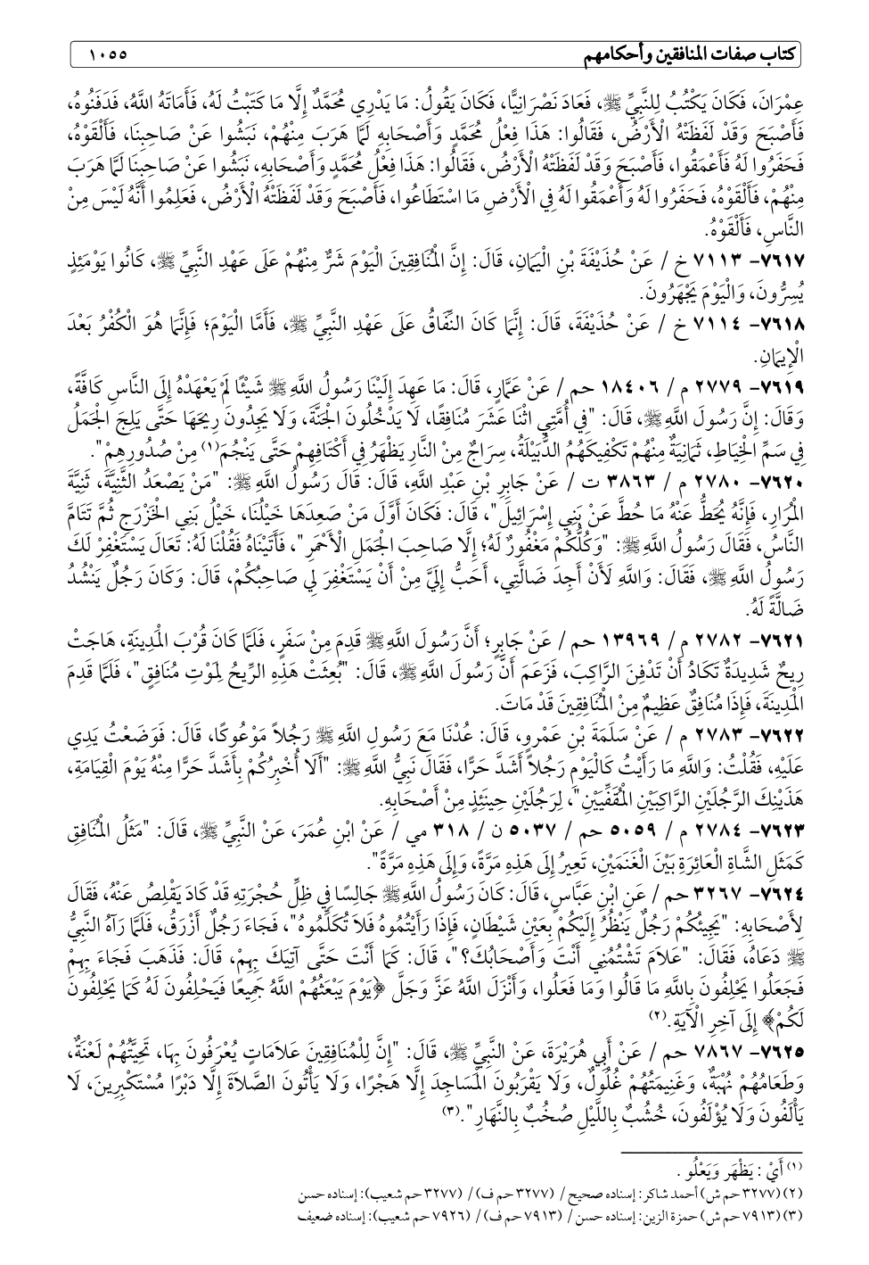 ٧٦١٨ - ٧١١٤ خ / عَنْ حُذَيْفَةَ، قَالَ: إِنَّمَا كَانَ النِّفَاقُ عَلَى عَهْدِ النَّبِيِّ - صلى الله عليه وسلم -، فَأَمَّا الْيَوْمَ؛ فَإِنَّمَا هُوَ الْكُفْرُ بَعْدَ الْإِيمَانِ.