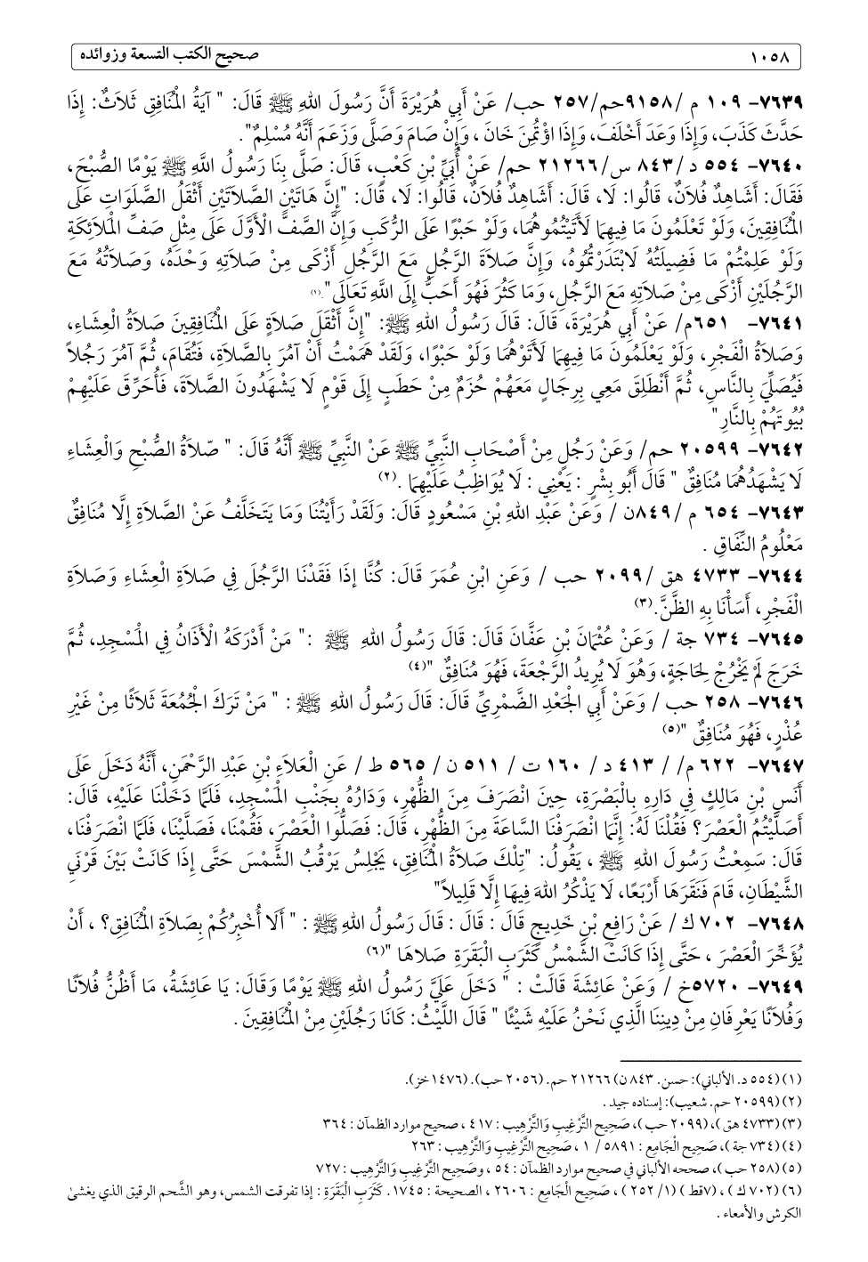 ٧٦٤٣ - ٦٥٤ م /٨٤٩ ن / وَعَنْ عَبْدِ اللهِ بْنِ مَسْعُودٍ قَالَ: وَلَقَدْ رَأَيْتُنَا وَمَا يَتَخَلَّفُ عَنْ الصَّلَاةِ إِلَّا مُنَافِقٌ مَعْلُومُ النِّفَاقِ.