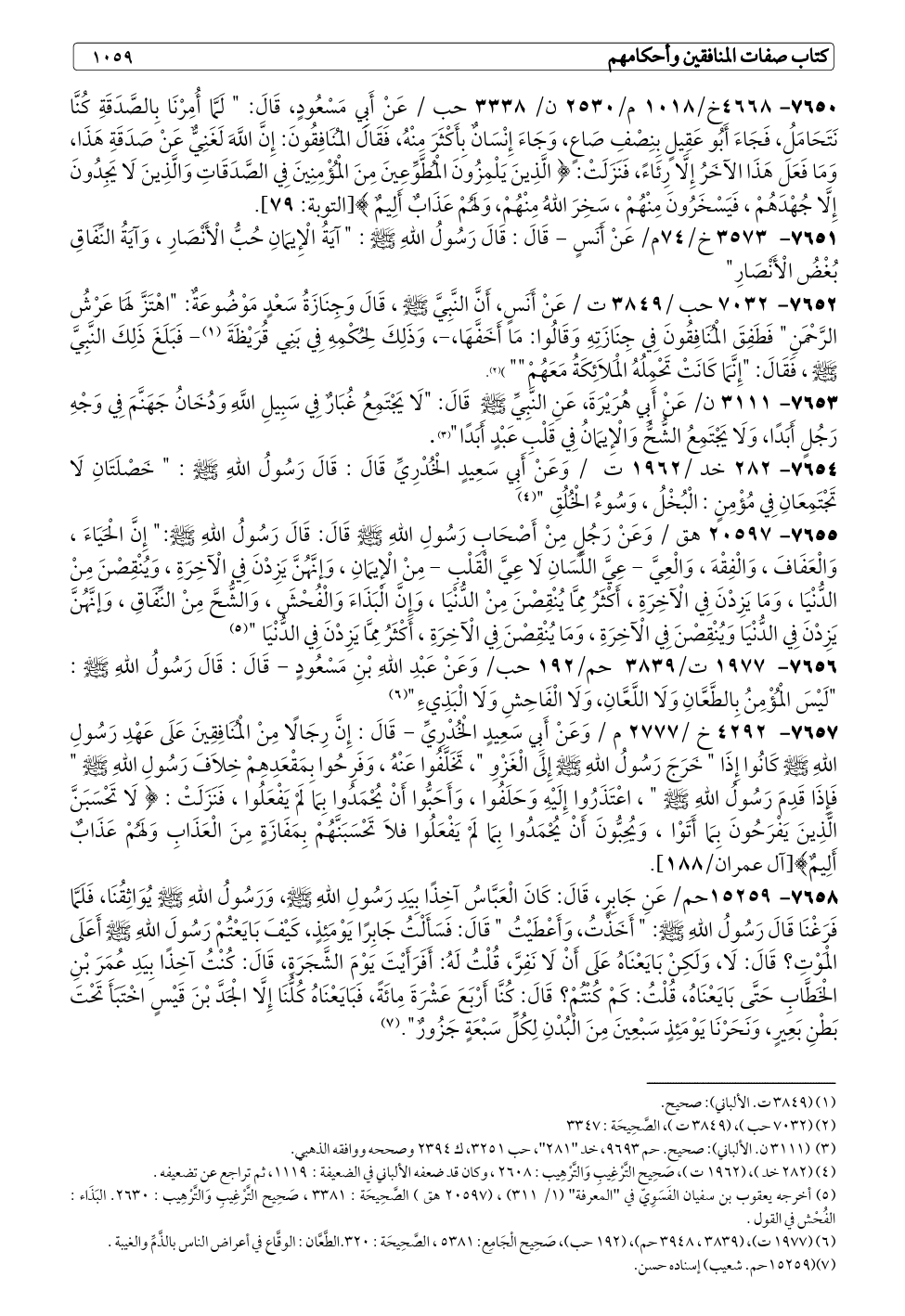٧٦٥٧ - ٤٢٩٢ خ /٢٧٧٧ م / وَعَنْ أَبِي سَعِيدٍ الْخُدْرِيِّ - رضي الله عنه - قَالَ: إِنَّ رِجَالًا مِنْ الْمُنَافِقِينَ عَلَى عَهْدِ رَسُولِ اللهِ - صلى الله عليه وسلم - كَانُوا إِذَا " خَرَجَ رَسُولُ اللهِ - صلى الله عليه وسلم - إِلَى الْغَزْوِ "، تَخَلَّفُوا عَنْهُ، وَفَرِحُوا بِمَقْعَدِهِمْ خِلَافَ رَسُولِ اللهِ - صلى الله عليه وسلم - " فَإِذَا قَدِمَ رَسُولُ اللهِ - صلى الله عليه وسلم - "، اعْتَذَرُوا إِلَيْهِ وَحَلَفُوا، وَأَحَبُّوا أَنْ يُحْمَدُوا بِمَا لَمْ يَفْعَلُوا، فَنَزَلَتْ: {لَا تَحْسَبَنَّ الَّذِينَ يَفْرَحُونَ بِمَا أَتَوْا، وَيُحِبُّونَ أَنْ يُحْمَدُوا بِمَا لَمْ يَفْعَلُوا فلَا تَحْسَبَنَّهُمْ بِمَفَازَةٍ مِنَ الْعَذَابِ وَلَهُمْ عَذَابٌ أَلِيمٌ} [آل عمران/١٨٨].