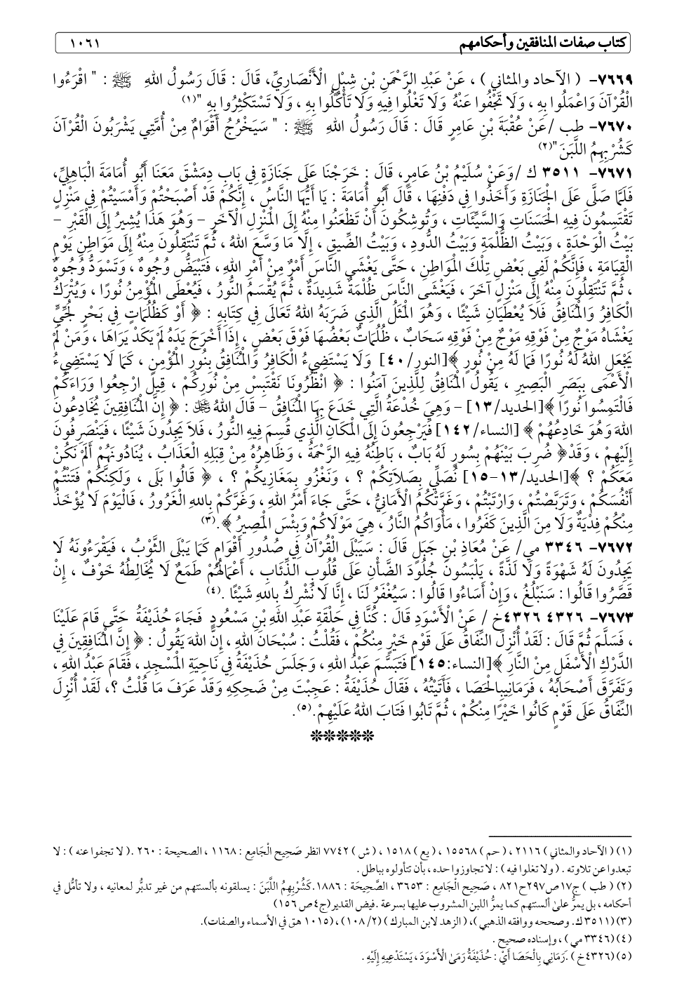 ٧٦٧٣ - ٤٣٢٦ خ / عَنْ الْأَسْوَدِ قَالَ: كُنَّا فِي حَلْقَةِ عَبْدِ اللهِ بْنِ مَسْعُودٍ فَجَاءَ حُذَيْفَةُ حَتَّى قَامَ عَلَيْنَا، فَسَلَّمَ ثُمَّ قَالَ: لَقَدْ أُنْزِلَ النِّفَاقُ عَلَى قَوْمٍ خَيْرٍ مِنْكُمْ، فَقُلْتُ: سُبْحَانَ اللهِ، إِنَّ اللهَ يَقُولُ: {إِنَّ الْمُنَافِقِينَ فِي الدَّرْكِ الْأَسْفَلِ مِنْ النَّارِ} [النساء:١٤٥] فَتَبَسَّمَ عَبْدُ اللهِ، وَجَلَسَ حُذَيْفَةُ فِي نَاحِيَةِ الْمَسْجِدِ، فَقَامَ عَبْدُ اللهِ، وَتَفَرَّقَ أَصْحَابُهُ، فَرَمَانِيبِالْحَصَا، فَأَتَيْتُهُ، فَقَالَ حُذَيْفَةُ: عَجِبْتَ مِنْ ضَحِكِهِ وَقَدْ عَرَفَ مَا قُلْتُ؟، لَقَدْ أُنْزِلَ النِّفَاقُ عَلَى قَوْمٍ كَانُوا خَيْرًا مِنْكُمْ، ثُمَّ تَابُوا فَتَابَ اللهُ عَلَيْهِمْ. (¬٥).
