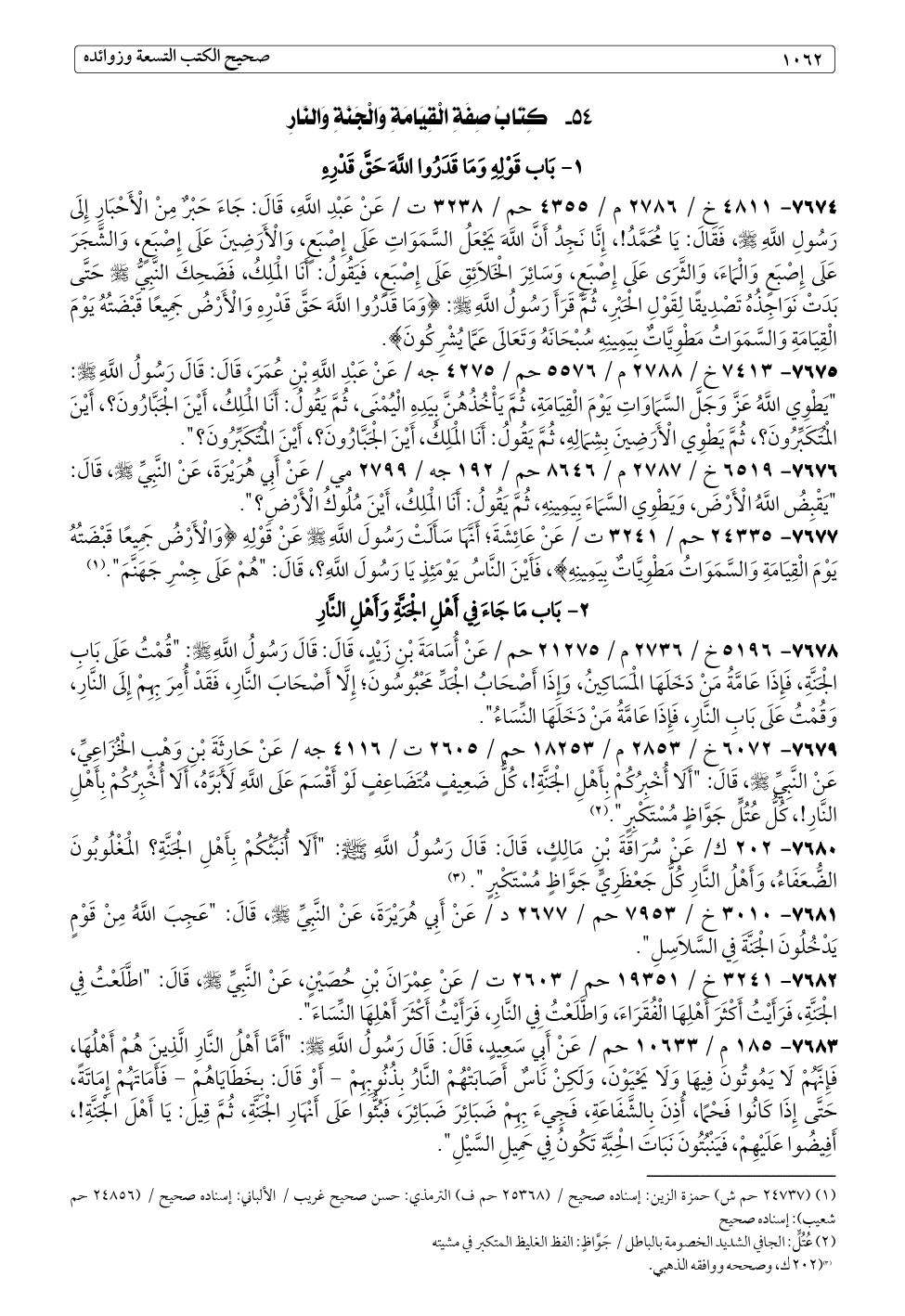 ٧٦٧٤ - ٤٨١١ خ / ٢٧٨٦ م / ٤٣٥٥ حم / ٣٢٣٨ ت / عَنْ عَبْدِ اللَّهِ، قَالَ: جَاءَ حَبْرٌ مِنْ الْأَحْبَارِ إِلَى رَسُولِ اللَّهِ - صلى الله عليه وسلم -، فَقَالَ: يَا مُحَمَّدُ!، إِنَّا نَجِدُ أَنَّ اللَّهَ يَجْعَلُ السَّمَوَاتِ عَلَى إِصْبَعٍ، وَالْأَرَضِينَ عَلَى إِصْبَعٍ، وَالشَّجَرَ عَلَى إِصْبَعٍ وَالْمَاءَ، وَالثَّرَى عَلَى إِصْبَعٍ، وَسَائِرَ الْخَلَائِقِ عَلَى إِصْبَعٍ، فَيَقُولُ: أَنَا الْمَلِكُ، فَضَحِكَ النَّبِيُّ - صلى الله عليه وسلم - حَتَّى بَدَتْ نَوَاجِذُهُ تَصْدِيقًا لِقَوْلِ الْحَبْرِ، ثُمَّ قَرَأَ رَسُولُ اللَّهِ - صلى الله عليه وسلم -: {وَمَا قَدَرُوا اللَّهَ حَقَّ قَدْرِهِ وَالْأَرْضُ جَمِيعًا قَبْضَتُهُ يَوْمَ الْقِيَامَةِ وَالسَّمَوَاتُ مَطْوِيَّاتٌ بِيَمِينِهِ سُبْحَانَهُ وَتَعَالَى عَمَّا يُشْرِكُونَ}.